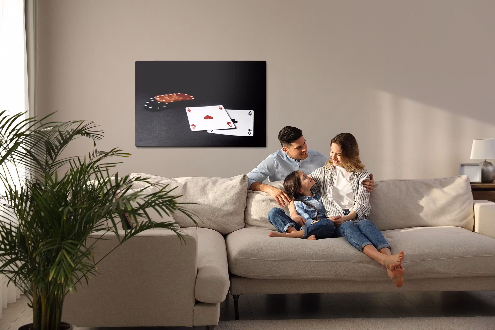 Motivet trycks runt hela ramen för ett stilrent och komplett utseende – ingen ytterram behövs. Tavlan levereras färdig att hängas upp; fäst bara ramen på en eller två skruvar. Kanttrycket gör att Poker cards and chips framträder lika vackert från sidan som framifrån, och helhetsintrycket förblir lugnt och balanserat.