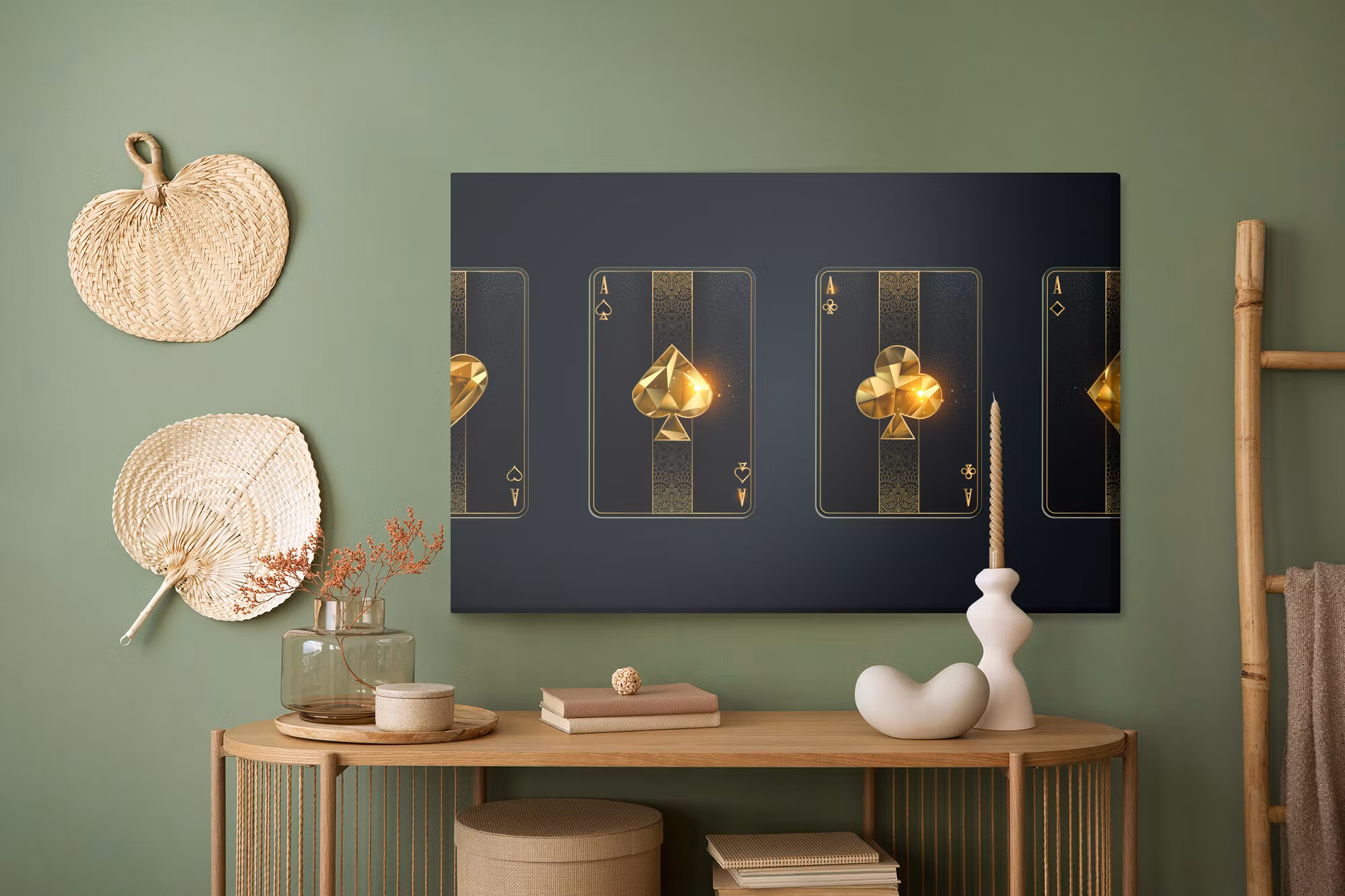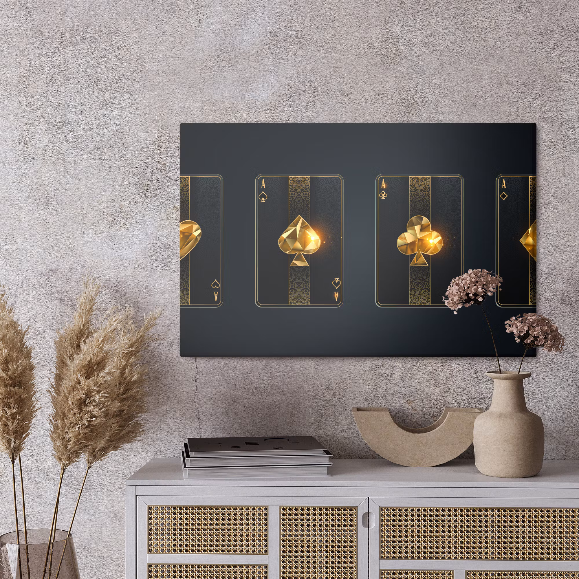 Motivet Black poker cards förenar estetik och teknik i en harmonisk komposition, där färgtonerna är noggrant balanserade för att framhäva djup, kontrast och rytm utan att kännas skarpa. Canvasen är monterad på en stabil fururam för ett professionellt uttryck som håller över tid. Resultatet är en canvastavla som förmedlar lugn och riktning – oavsett om den hänger i vardagsrum, sovrum eller kontor. Ljuset i motivet skapar mjuka övergångar och ger en känsla av stillhet i rummet.