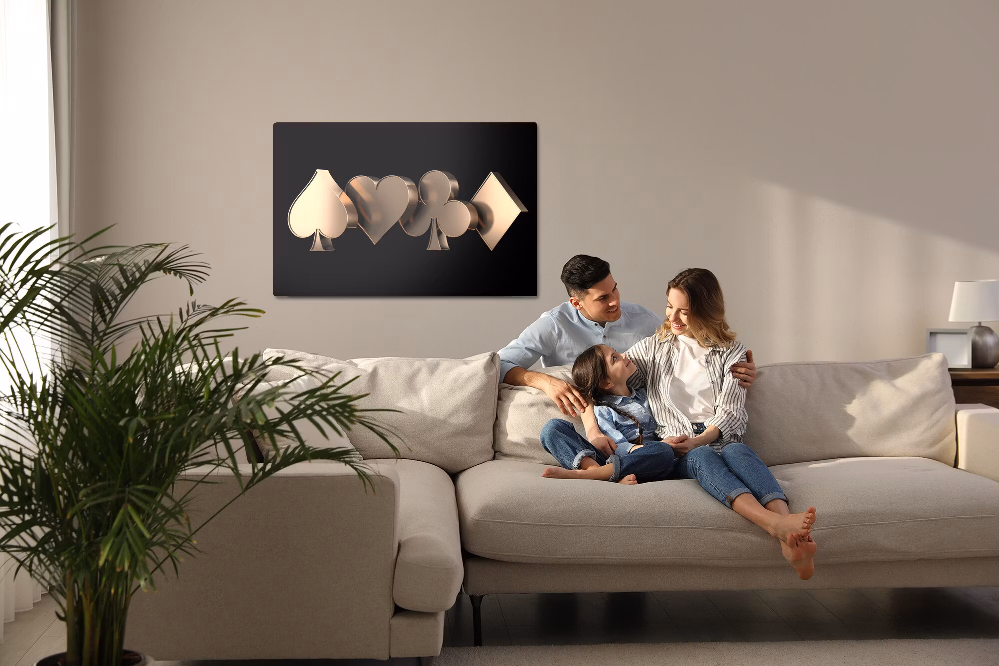 Motivet trycks runt hela ramen för ett stilrent och komplett utseende – ingen ytterram behövs. Tavlan levereras färdig att hängas upp; fäst bara ramen på en eller två skruvar. Kanttrycket gör att 3d card symbols framträder lika vackert från sidan som framifrån, och helhetsintrycket förblir lugnt och balanserat.