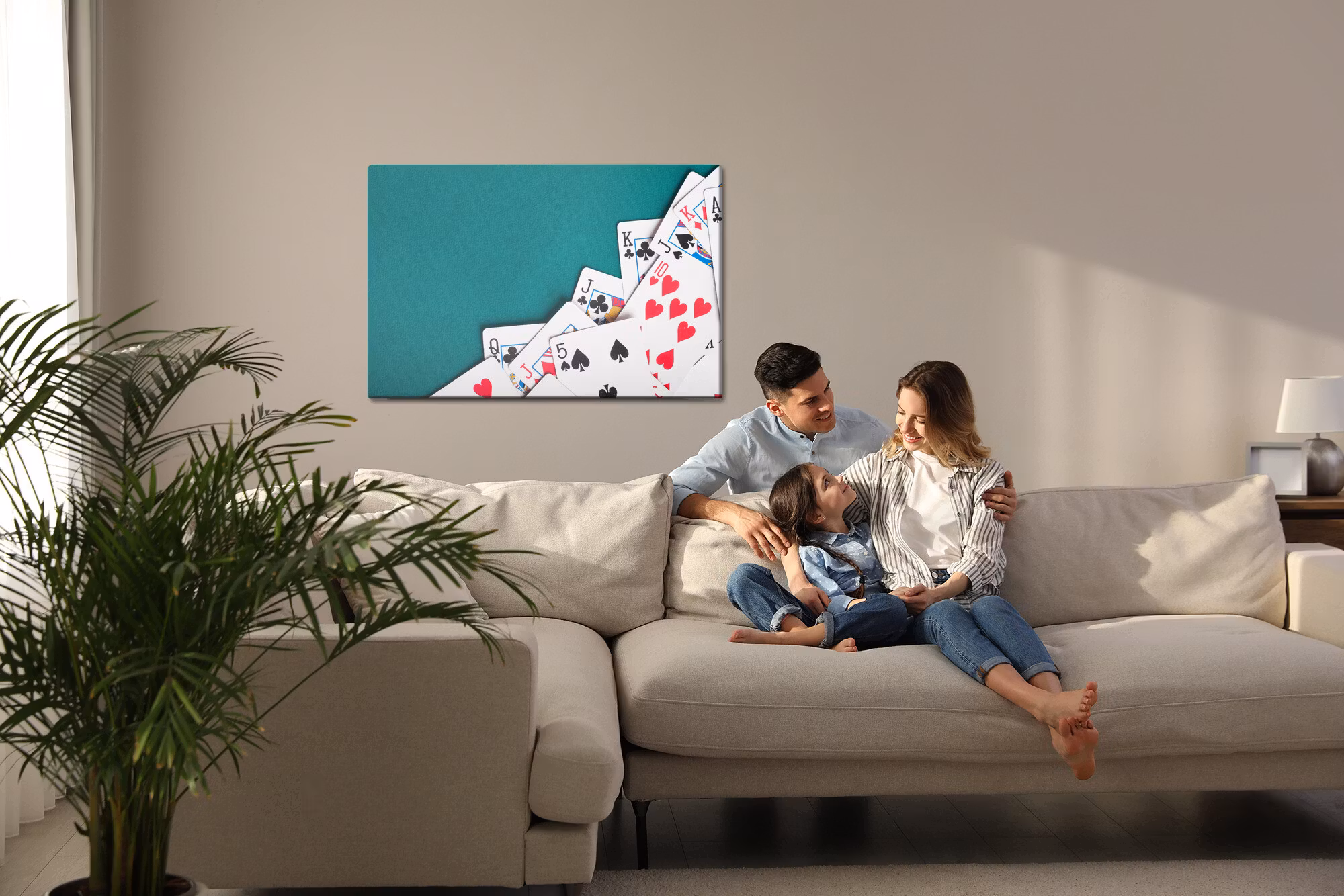 Motivet A scattered deck of cards förenar estetik och teknik i en harmonisk komposition, där färgtonerna är noggrant balanserade för att framhäva djup, kontrast och rytm utan att kännas skarpa. Canvasen är monterad på en stabil fururam för ett professionellt uttryck som håller över tid. Resultatet är en canvastavla som förmedlar lugn och riktning – oavsett om den hänger i vardagsrum, sovrum eller kontor. Ljuset i motivet skapar mjuka övergångar och ger en känsla av stillhet i rummet.