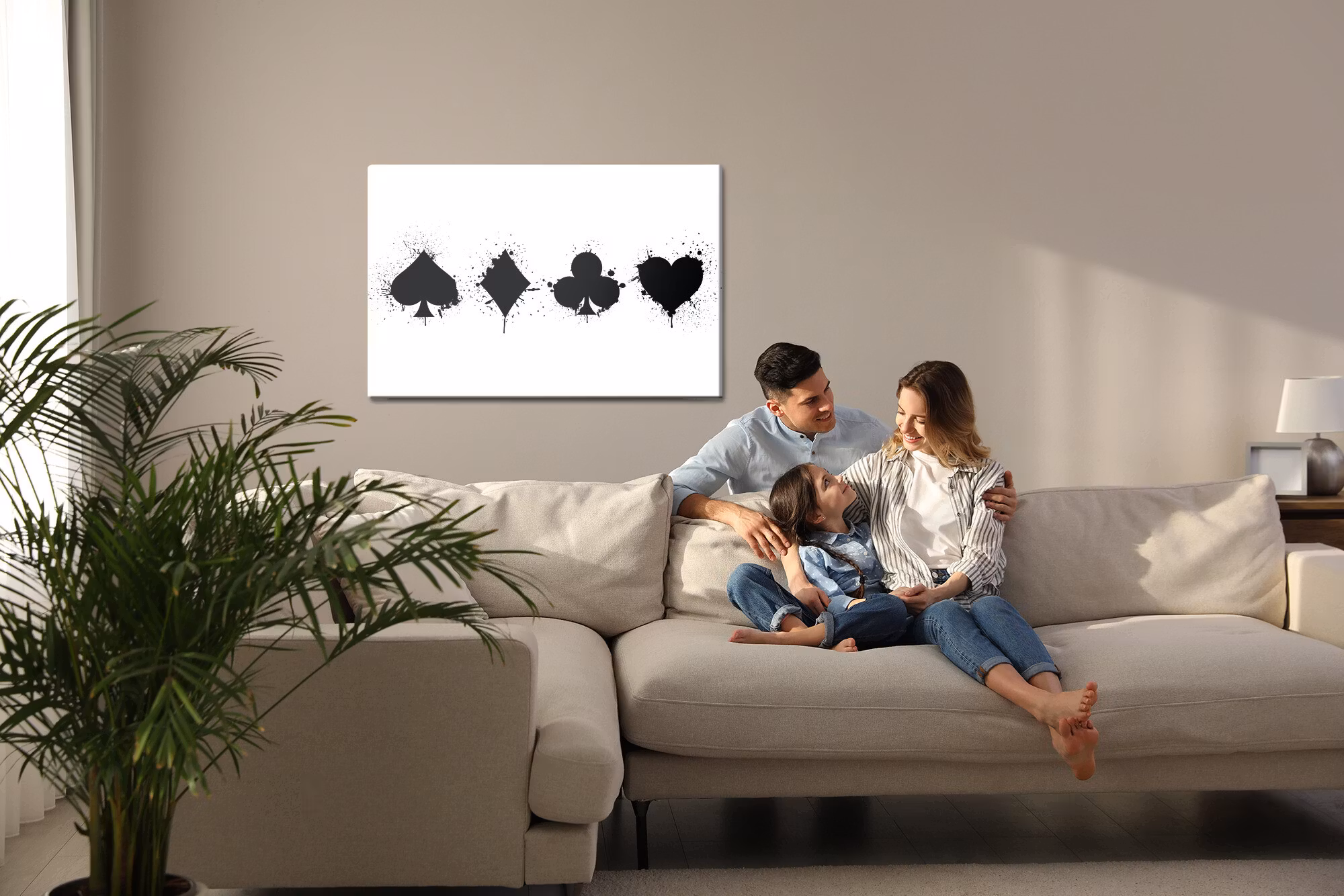 Motivet trycks runt hela ramen för ett stilrent och komplett utseende – ingen ytterram behövs. Tavlan levereras färdig att hängas upp; fäst bara ramen på en eller två skruvar. Kanttrycket gör att Abstract card symbols framträder lika vackert från sidan som framifrån, och helhetsintrycket förblir lugnt och balanserat.