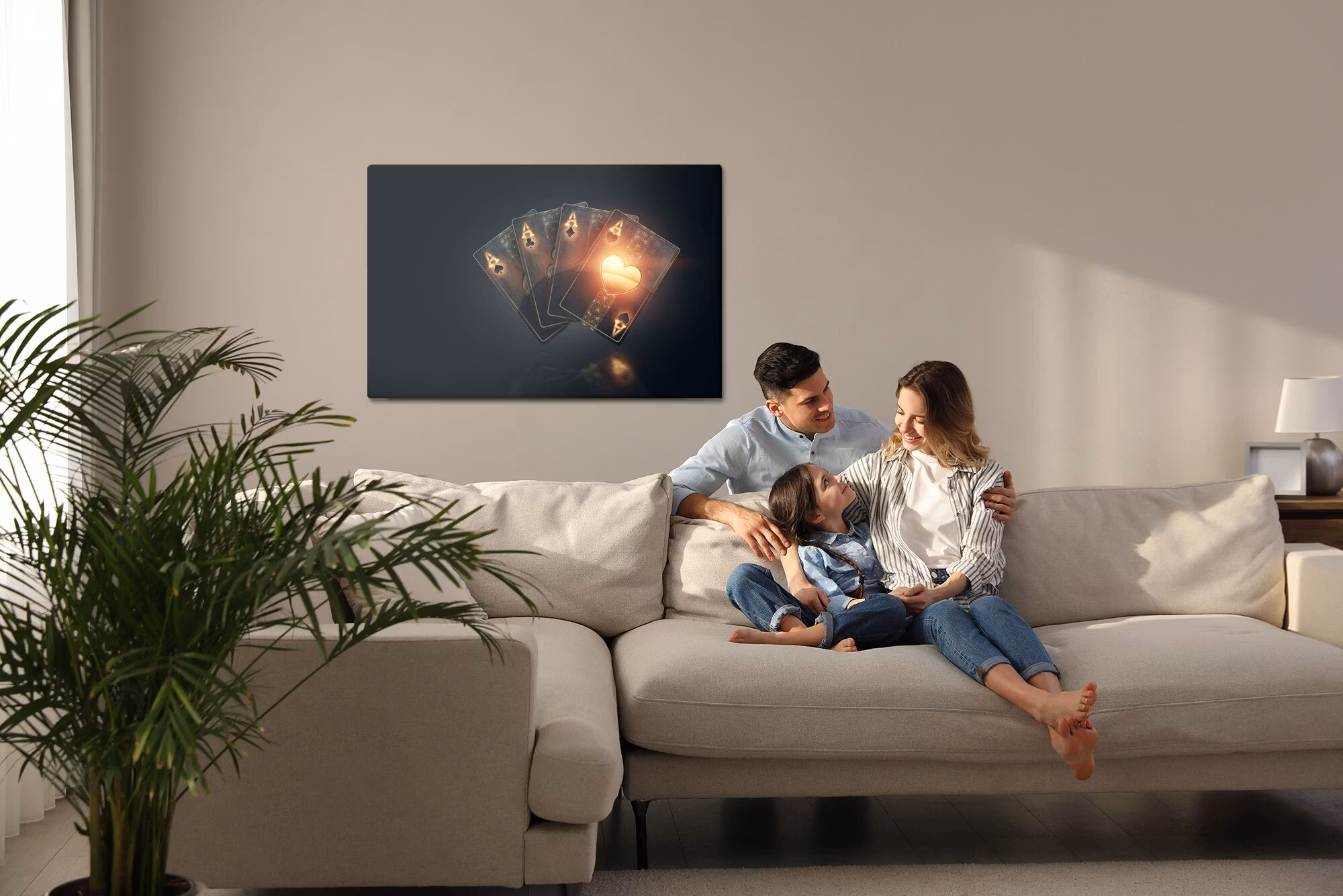 Motivet trycks runt hela ramen för ett stilrent och komplett utseende – ingen ytterram behövs. Tavlan levereras färdig att hängas upp; fäst bara ramen på en eller två skruvar. Kanttrycket gör att Black poker playing cards framträder lika vackert från sidan som framifrån, och helhetsintrycket förblir lugnt och balanserat.