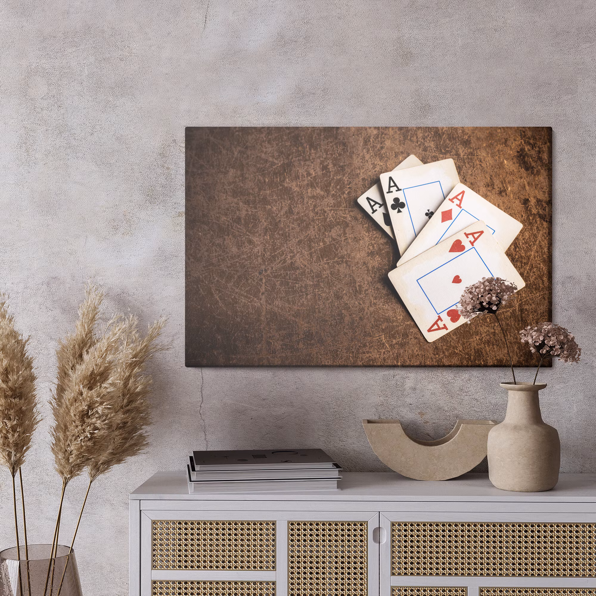 Motivet Old playing cards förenar estetik och teknik i en harmonisk komposition, där färgtonerna är noggrant balanserade för att framhäva djup, kontrast och rytm utan att kännas skarpa. Canvasen är monterad på en stabil fururam för ett professionellt uttryck som håller över tid. Resultatet är en canvastavla som förmedlar lugn och riktning – oavsett om den hänger i vardagsrum, sovrum eller kontor. Ljuset i motivet skapar mjuka övergångar och ger en känsla av stillhet i rummet.