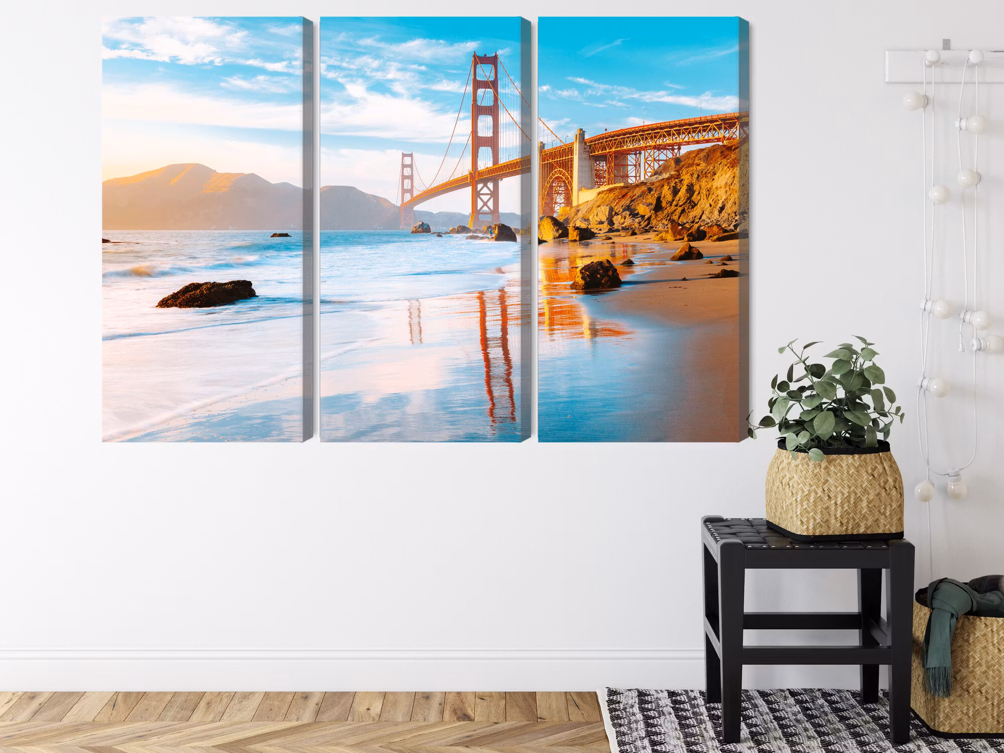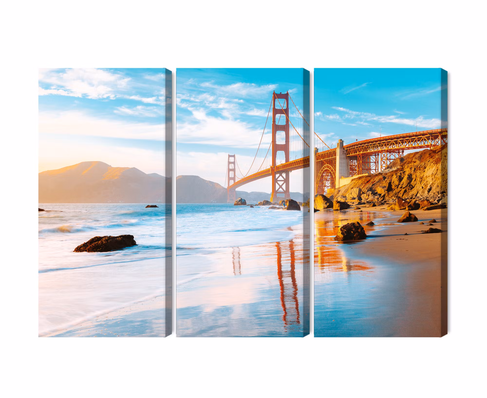 Motivet trycks runt hela ramen för ett stilrent och komplett utseende – ingen ytterram behövs. Tavlan levereras färdig att hängas upp; fäst bara ramen på en eller två skruvar. Kanttrycket gör att The Golden Gate bridge in San Francisco framträder lika vackert från sidan som framifrån, och helhetsintrycket förblir lugnt och balanserat.
