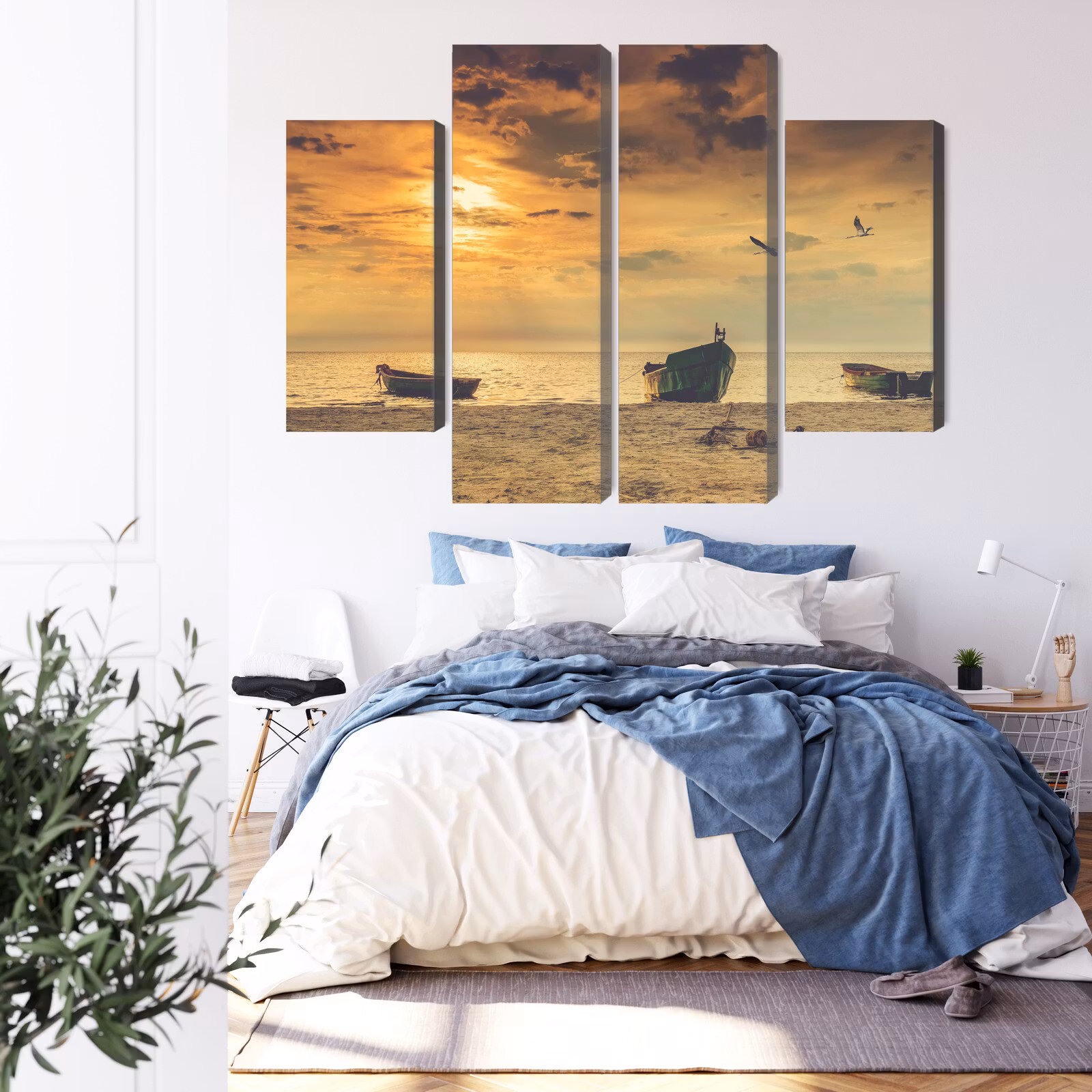 Lugna nyanser i Boats on the beach at sunset skapar en vilopunkt där blicken kan stanna utan att rummet känns tungt.