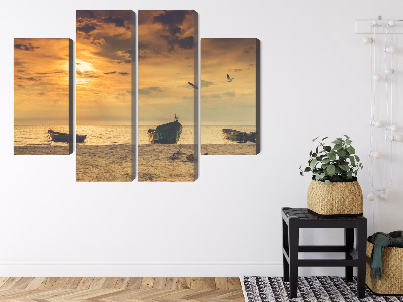 Motivet trycks runt hela ramen för ett stilrent och komplett utseende – ingen ytterram behövs. Tavlan levereras färdig att hängas upp; fäst bara ramen på en eller två skruvar. Kanttrycket gör att Boats on the beach at sunset framträder lika vackert från sidan som framifrån, och helhetsintrycket förblir lugnt och balanserat.