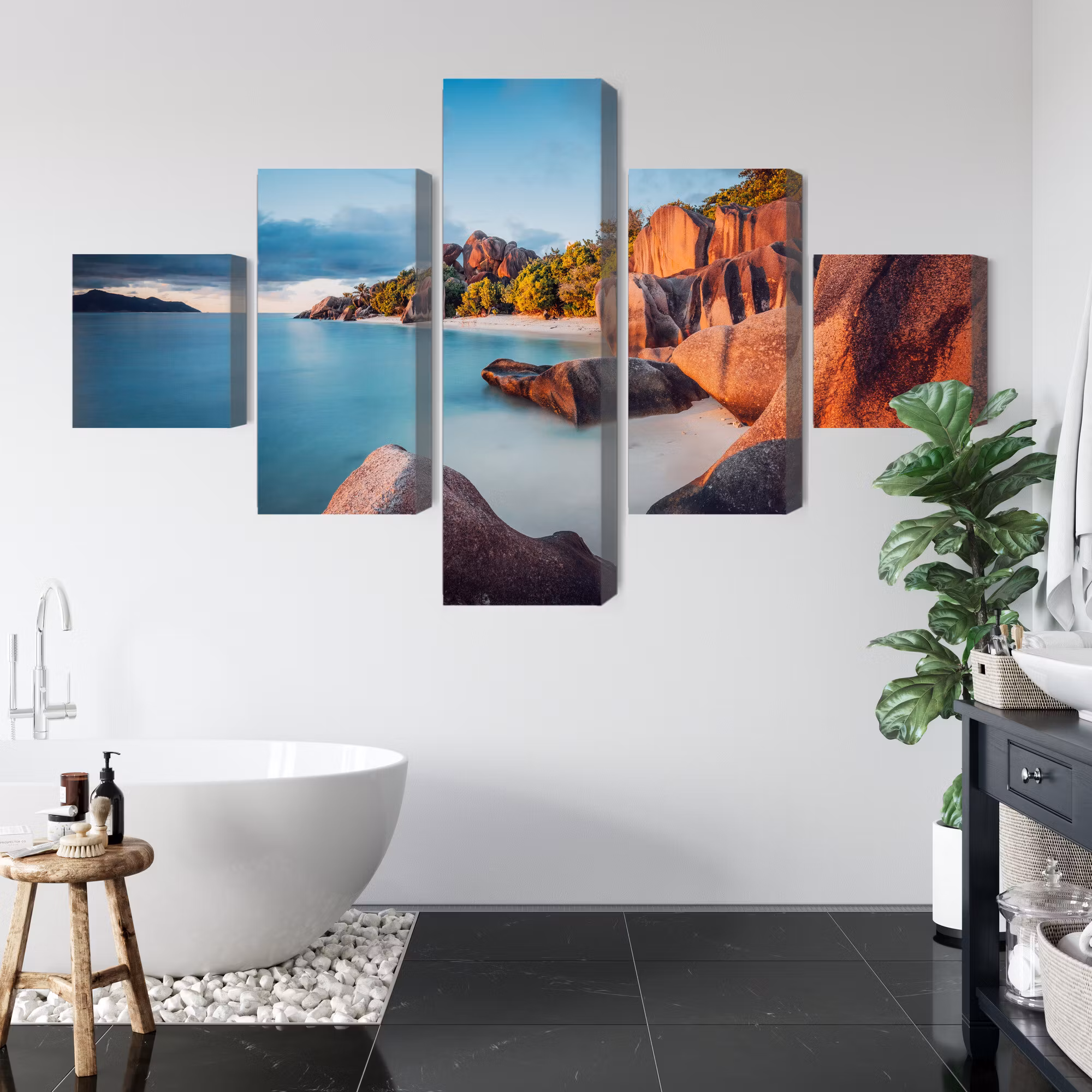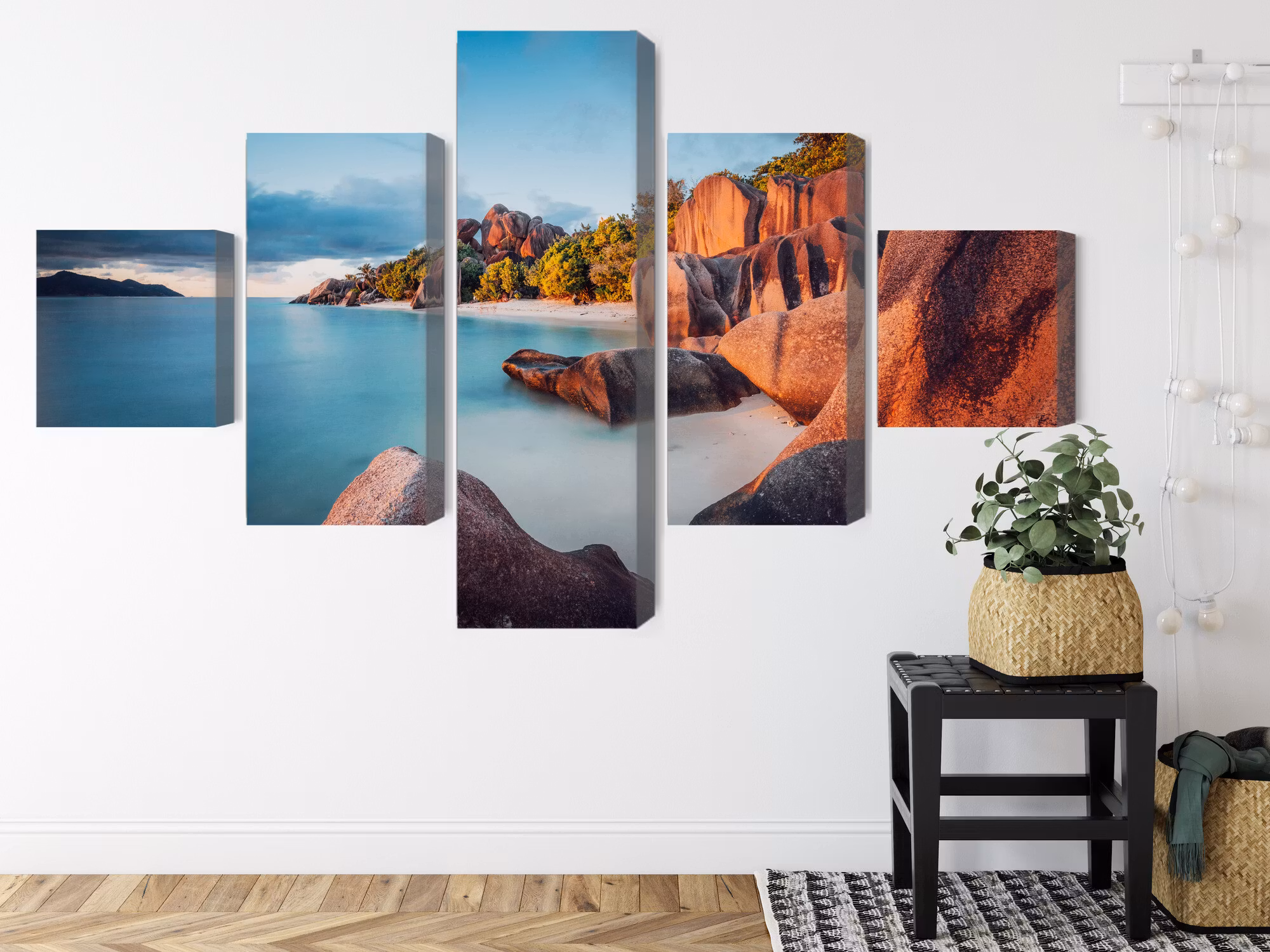 Motivet trycks runt hela ramen för ett stilrent och komplett utseende – ingen ytterram behövs. Tavlan levereras färdig att hängas upp; fäst bara ramen på en eller två skruvar. Kanttrycket gör att Beach in seychelles framträder lika vackert från sidan som framifrån, och helhetsintrycket förblir lugnt och balanserat.