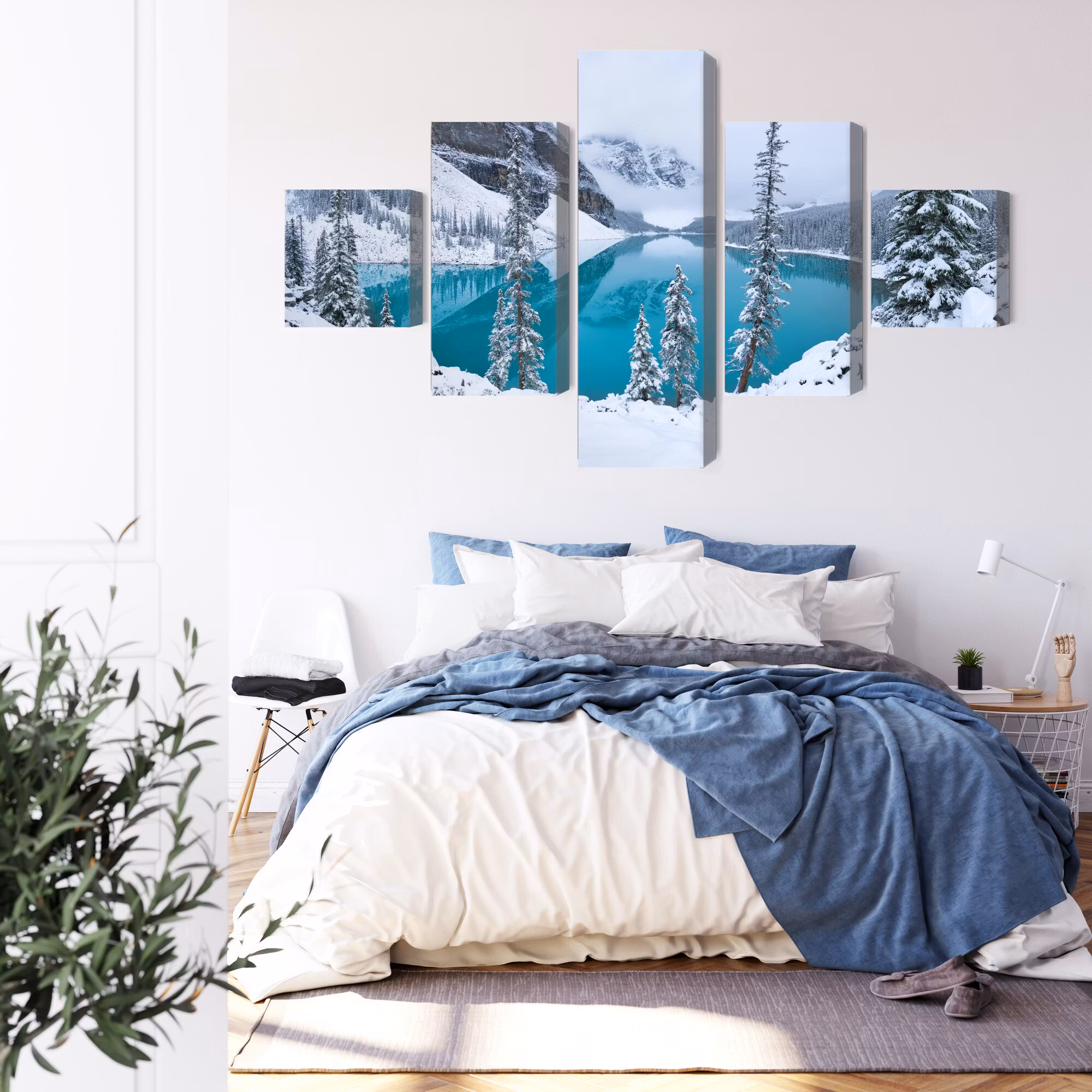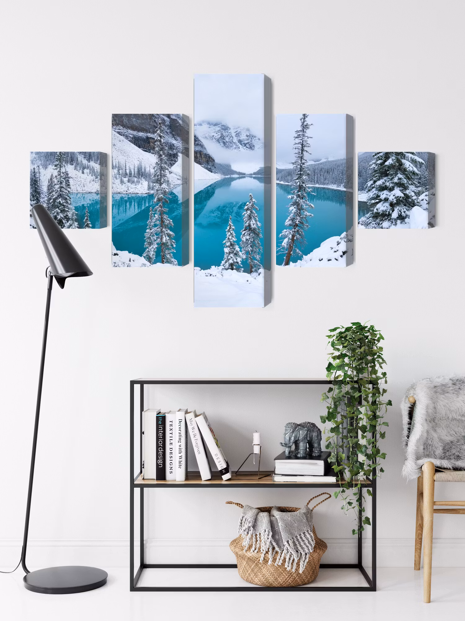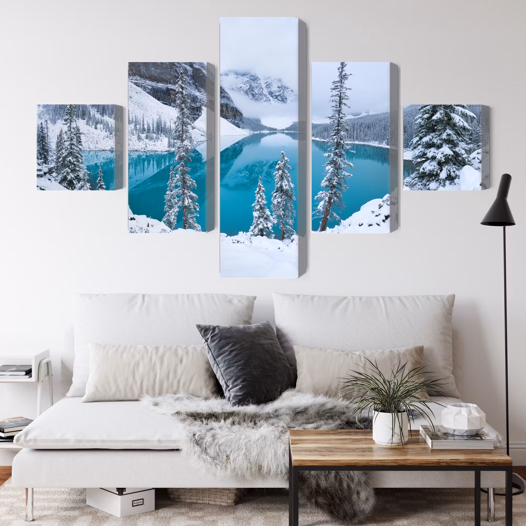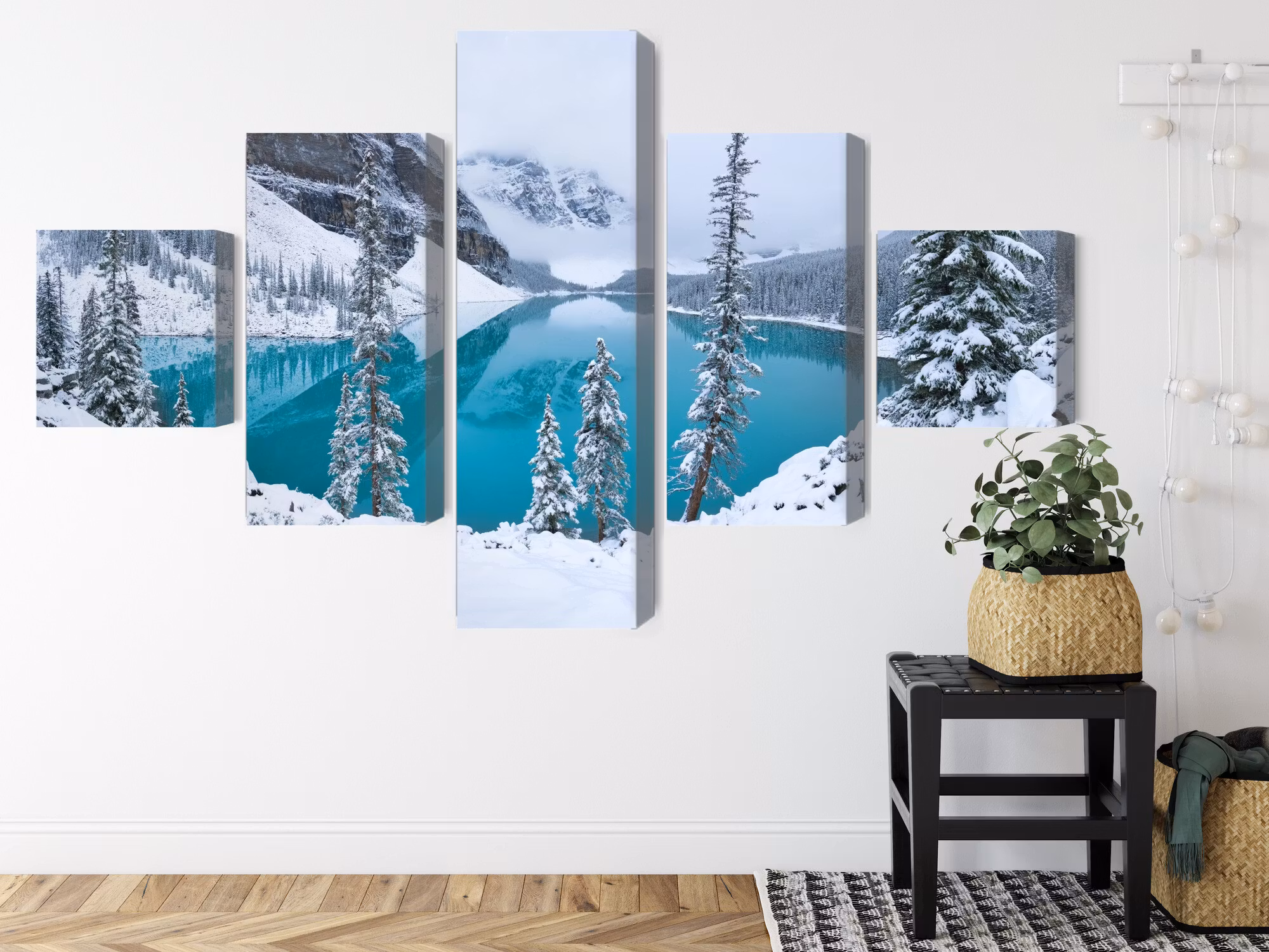 Motivet trycks runt hela ramen för ett stilrent och komplett utseende – ingen ytterram behövs. Tavlan levereras färdig att hängas upp; fäst bara ramen på en eller två skruvar. Kanttrycket gör att Moraine Lake in winter framträder lika vackert från sidan som framifrån, och helhetsintrycket förblir lugnt och balanserat.