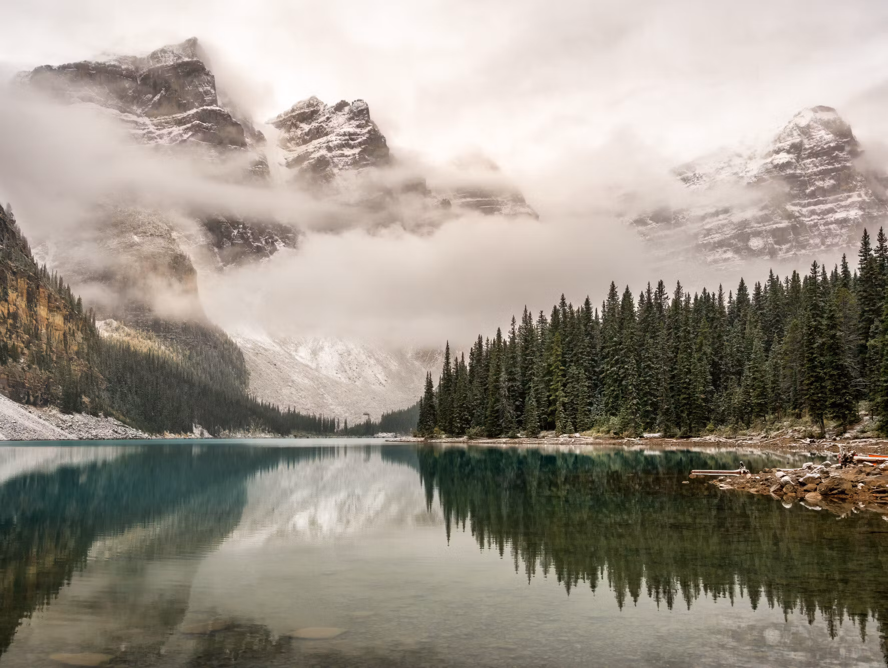 Lugna nyanser i Moraine Lake in banff national park, skapar en vilopunkt där blicken kan stanna utan att rummet känns tungt.