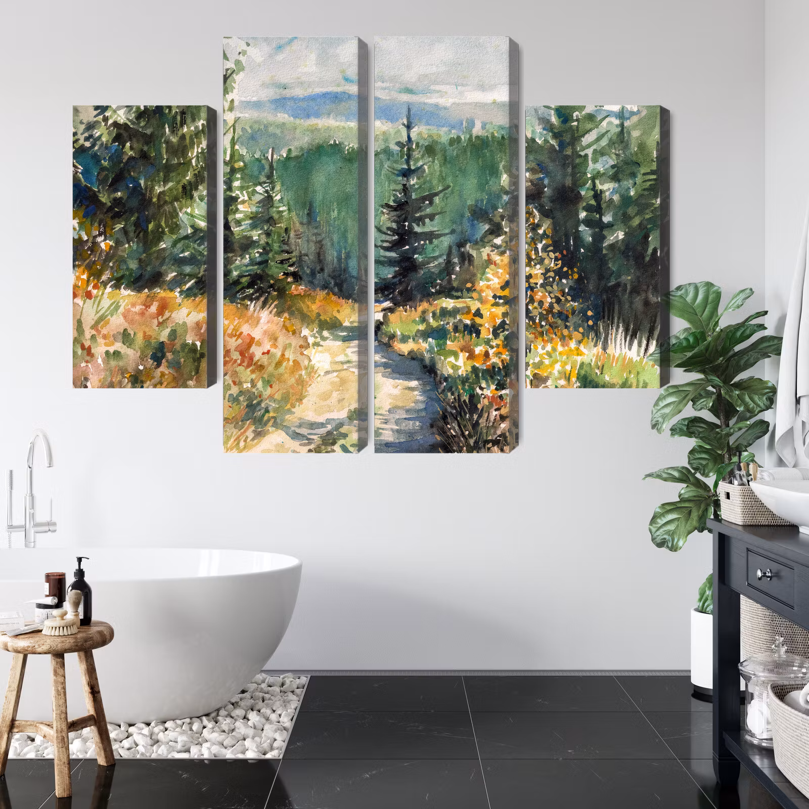 Motivet Forest landscape painted with watercolors förenar estetik och teknik i en harmonisk komposition, där färgtonerna är noggrant balanserade för att framhäva djup, kontrast och rytm utan att kännas skarpa. Canvasen är monterad på en stabil fururam för ett professionellt uttryck som håller över tid. Resultatet är en canvastavla som förmedlar lugn och riktning – oavsett om den hänger i vardagsrum, sovrum eller kontor. Ljuset i motivet skapar mjuka övergångar och ger en känsla av stillhet i rummet.
