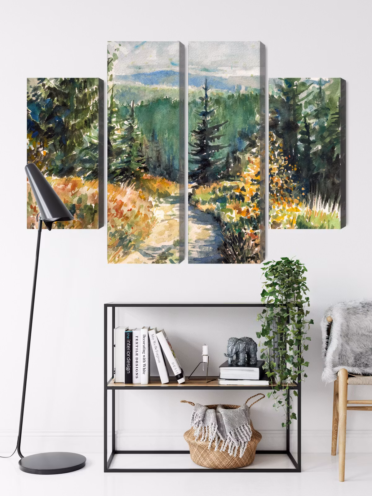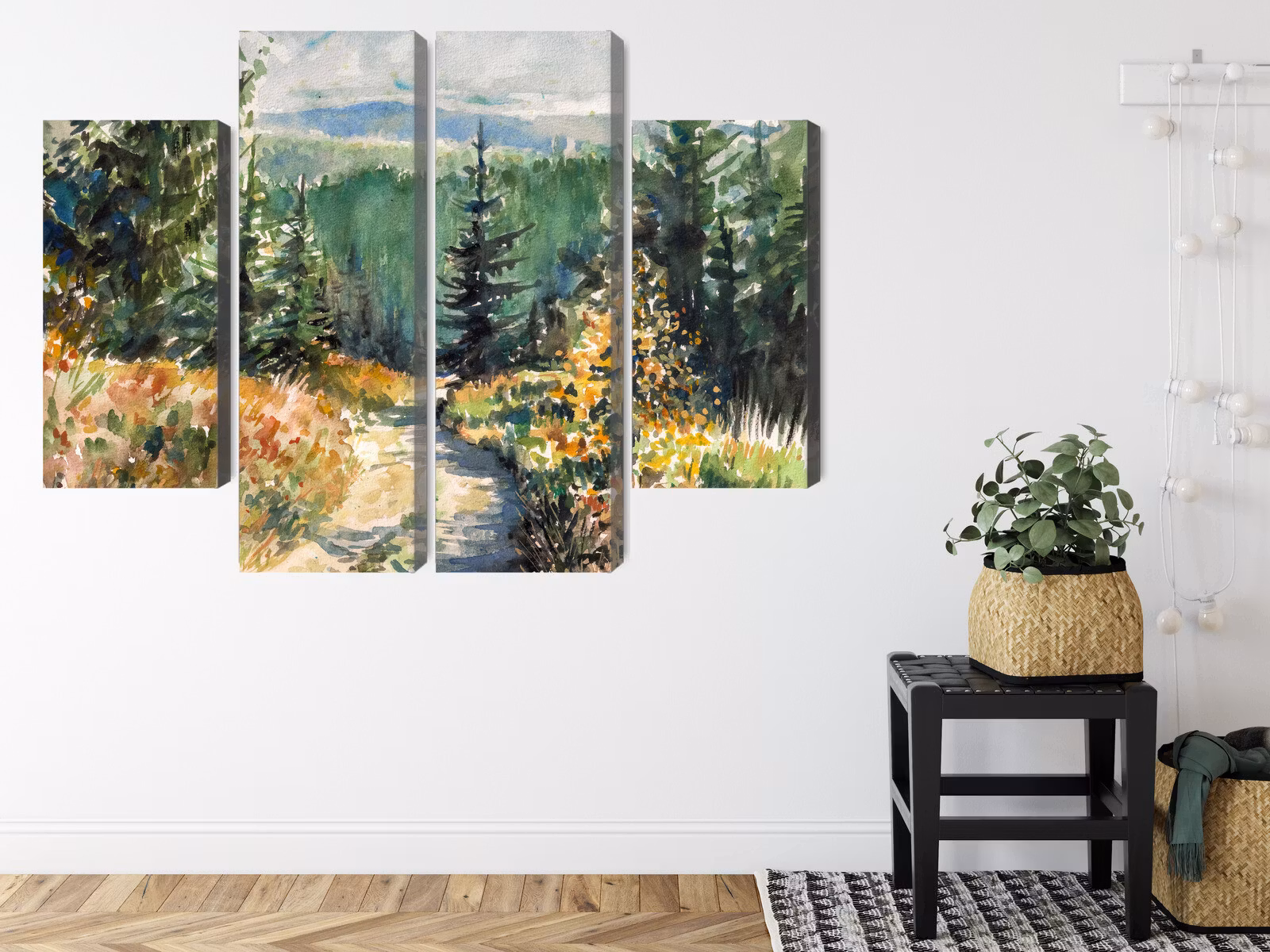 Forest landscape painted with watercolors binder samman inne och ute. Tonerna landar naturligt mot trä, linne och ljusa väggar.