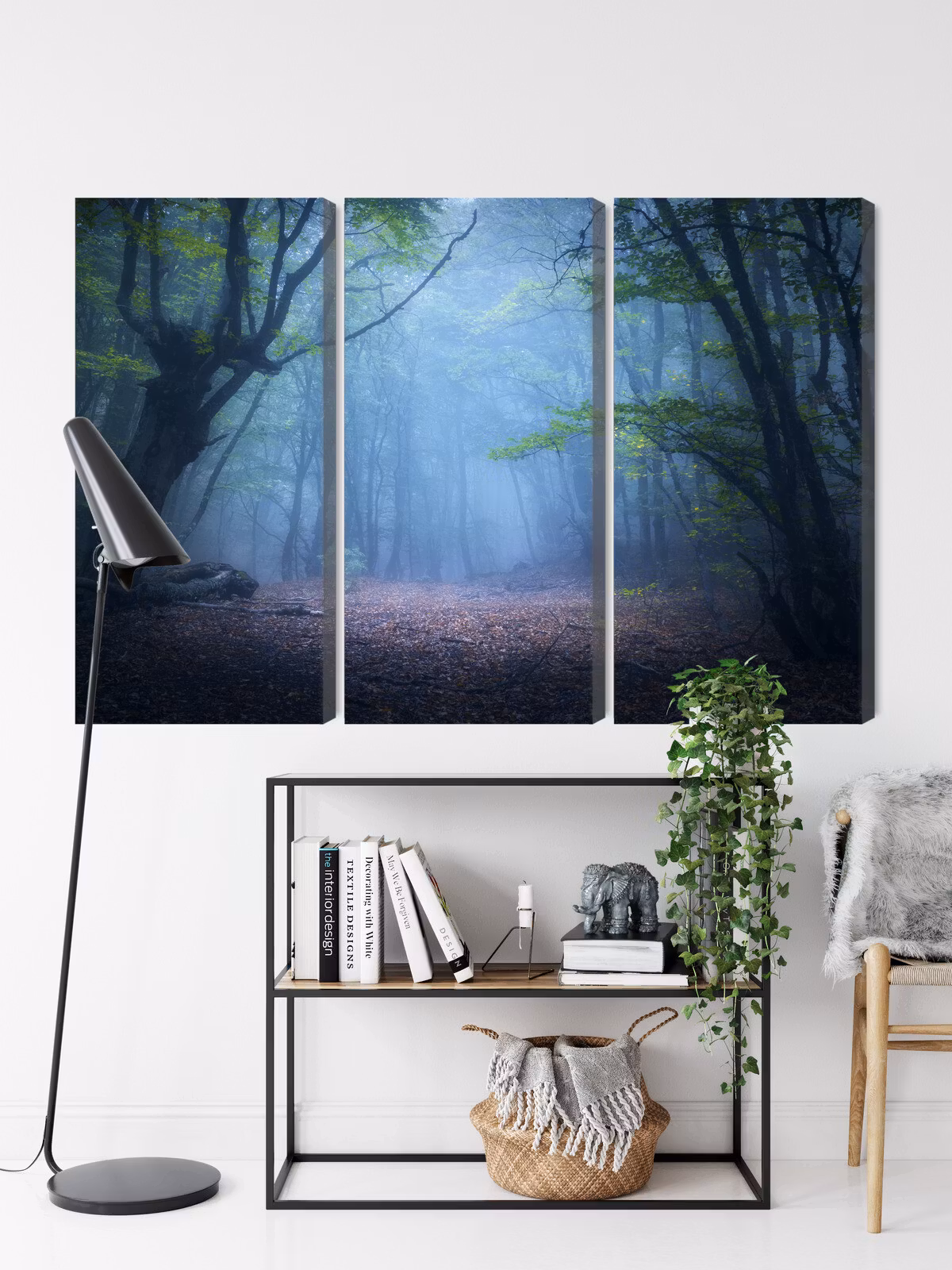 Motivet trycks runt hela ramen för ett stilrent och komplett utseende – ingen ytterram behövs. Tavlan levereras färdig att hängas upp; fäst bara ramen på en eller två skruvar. Kanttrycket gör att Hazy 3d forest landscape framträder lika vackert från sidan som framifrån, och helhetsintrycket förblir lugnt och balanserat.