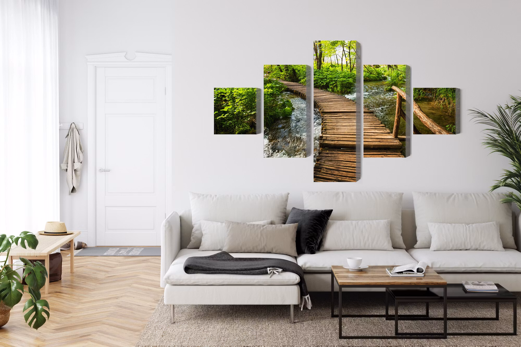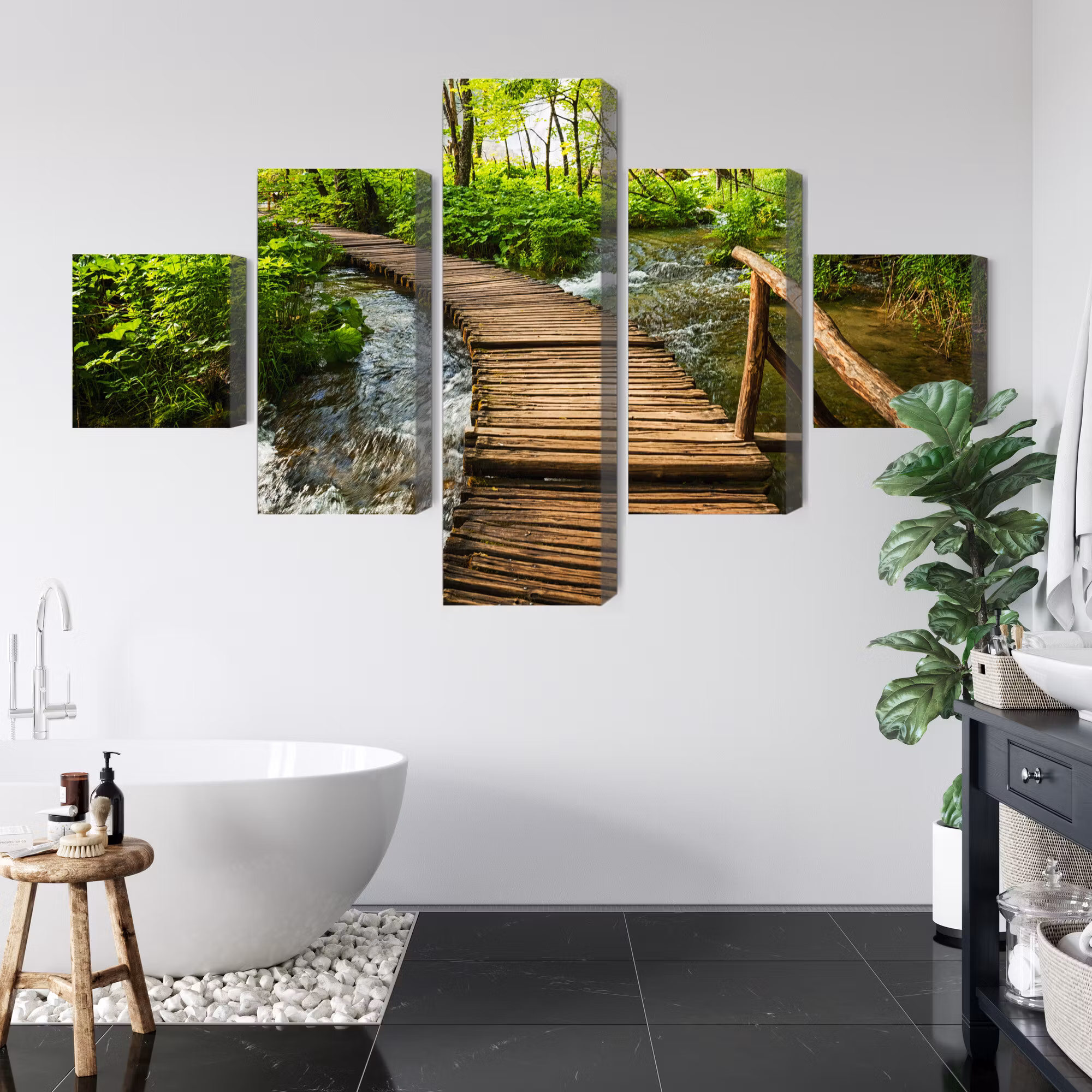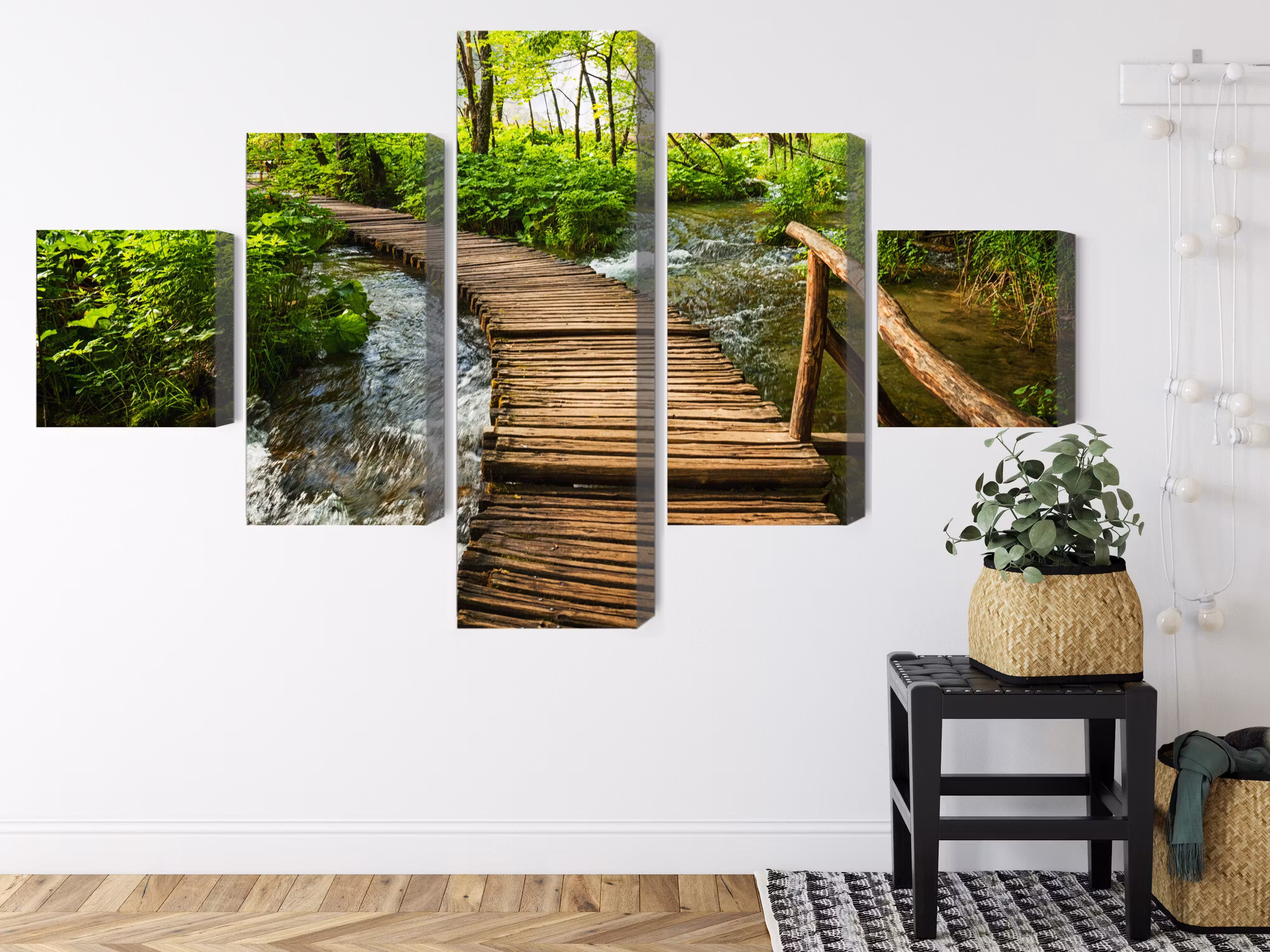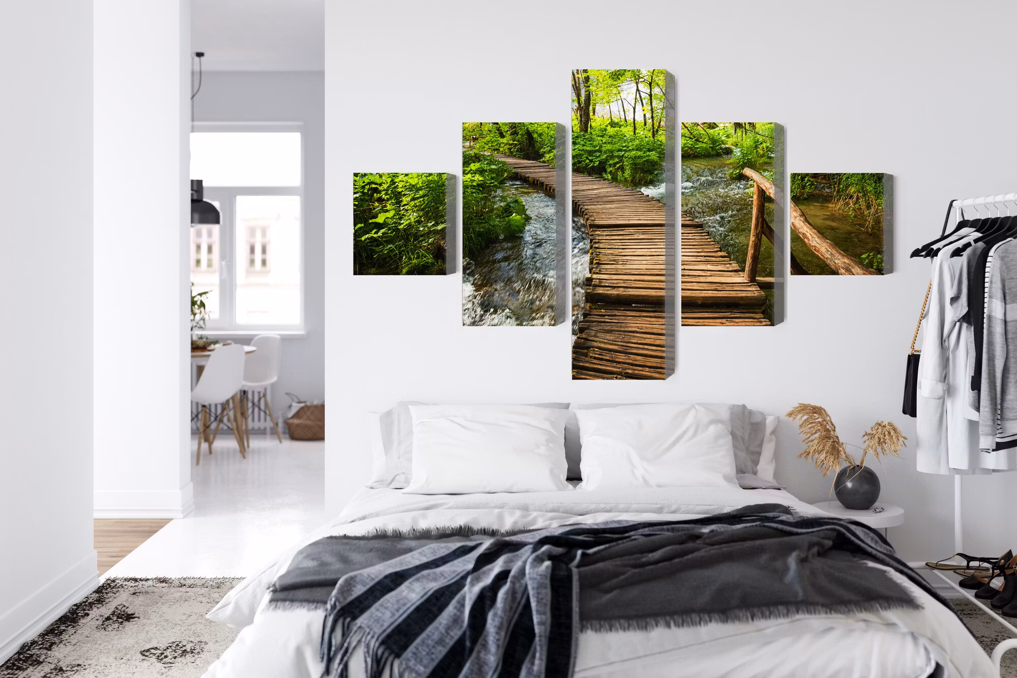 Motivet trycks runt hela ramen för ett stilrent och komplett utseende – ingen ytterram behövs. Tavlan levereras färdig att hängas upp; fäst bara ramen på en eller två skruvar. Kanttrycket gör att Wooden pier in the forest framträder lika vackert från sidan som framifrån, och helhetsintrycket förblir lugnt och balanserat.