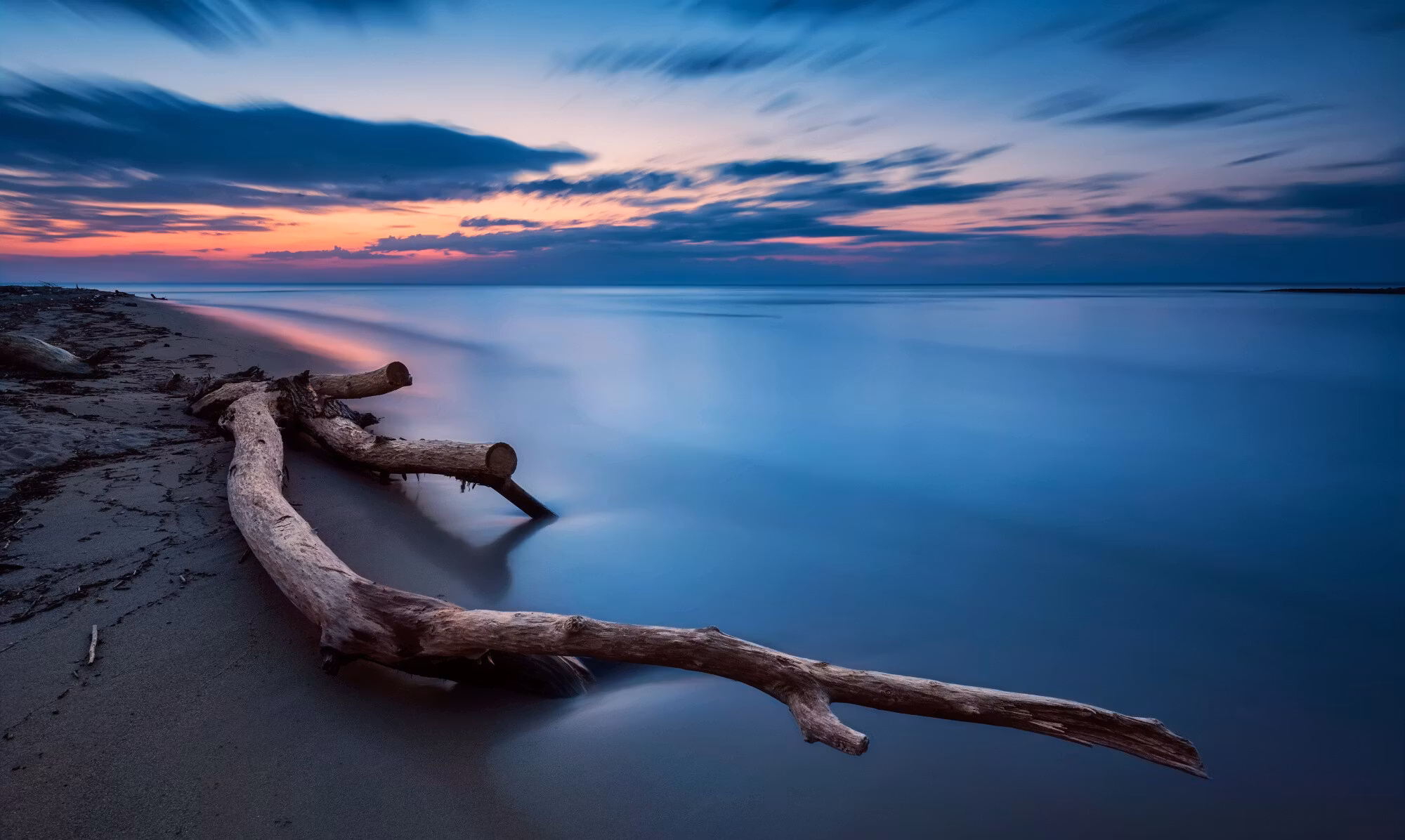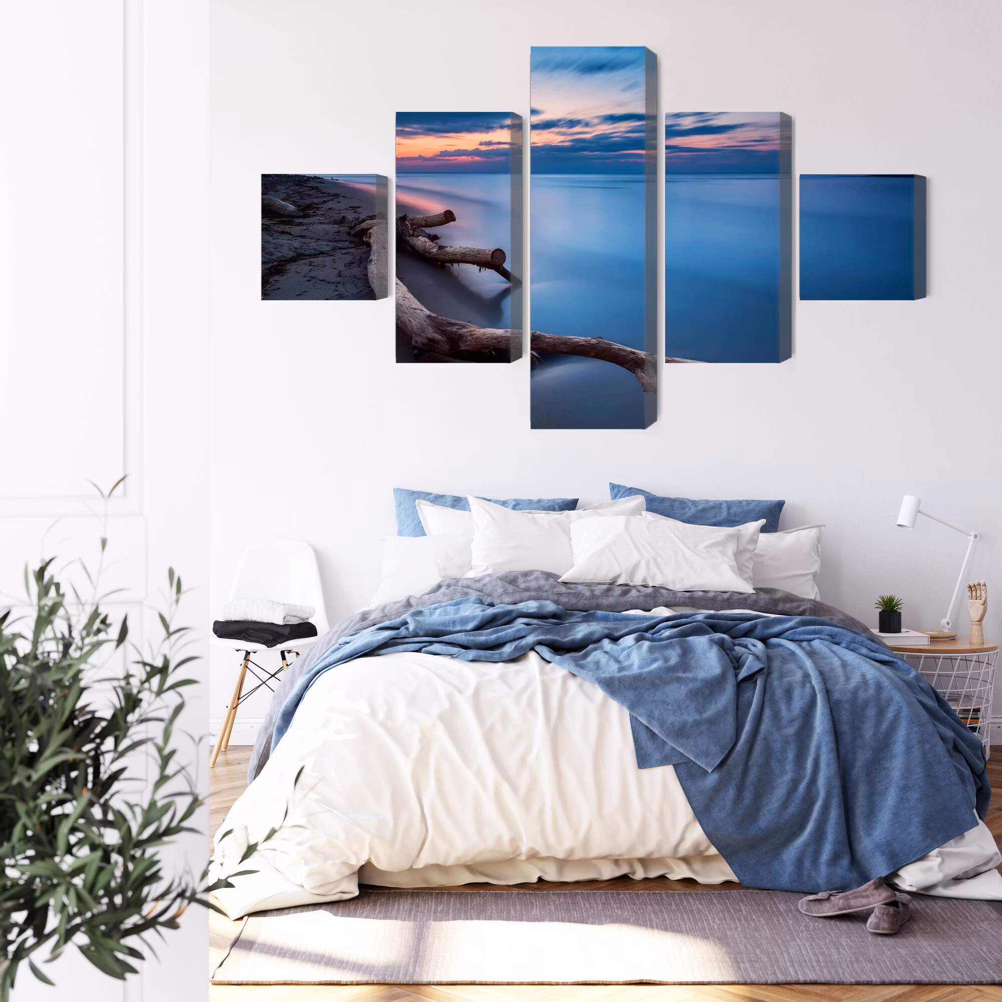 The sea landscape at evening time binder samman inne och ute. Tonerna landar naturligt mot trä, linne och ljusa väggar.