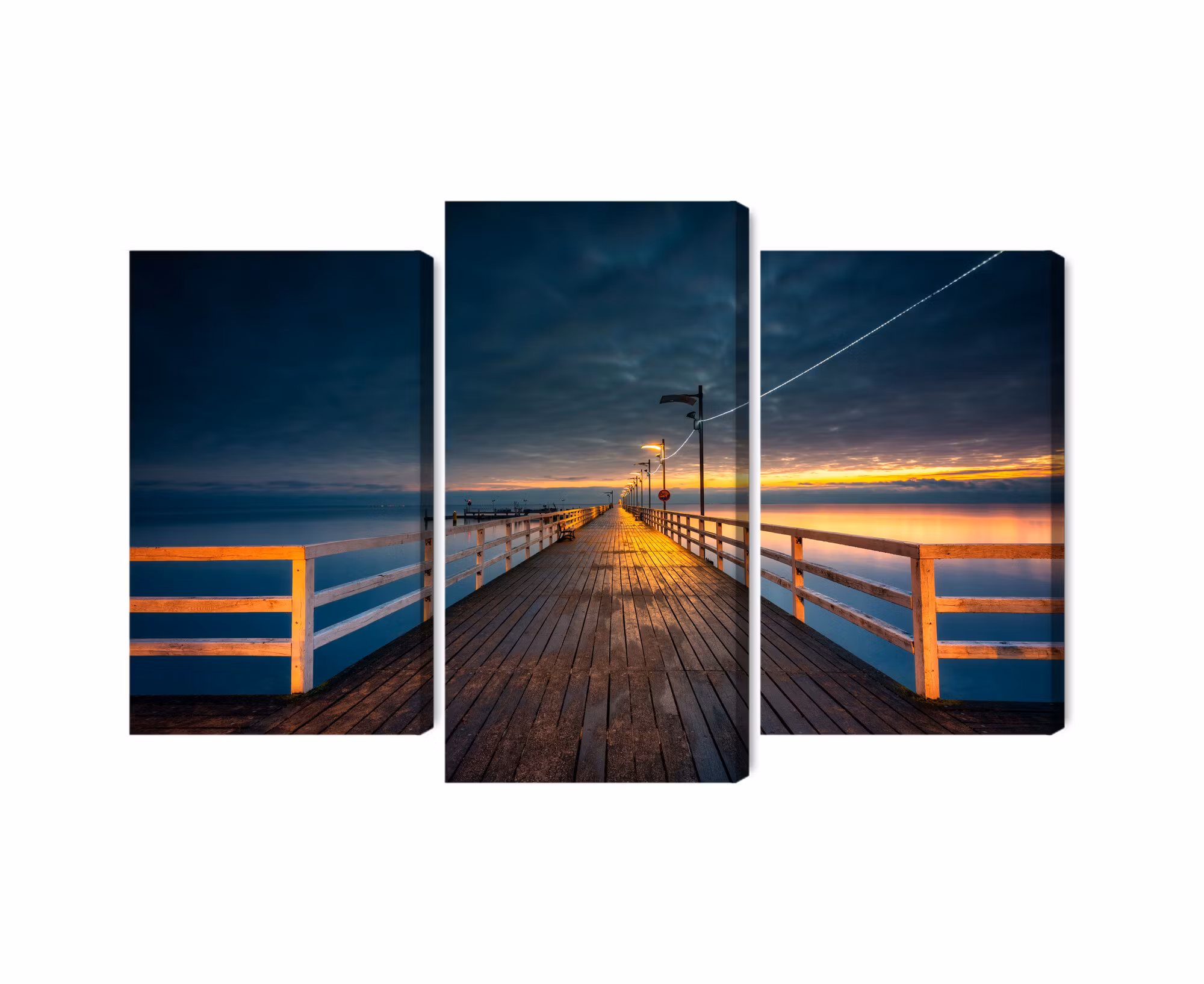 Canvastavlan Evening view of the wooden pier finns i två varianter beroende på vilken känsla du vill skapa.