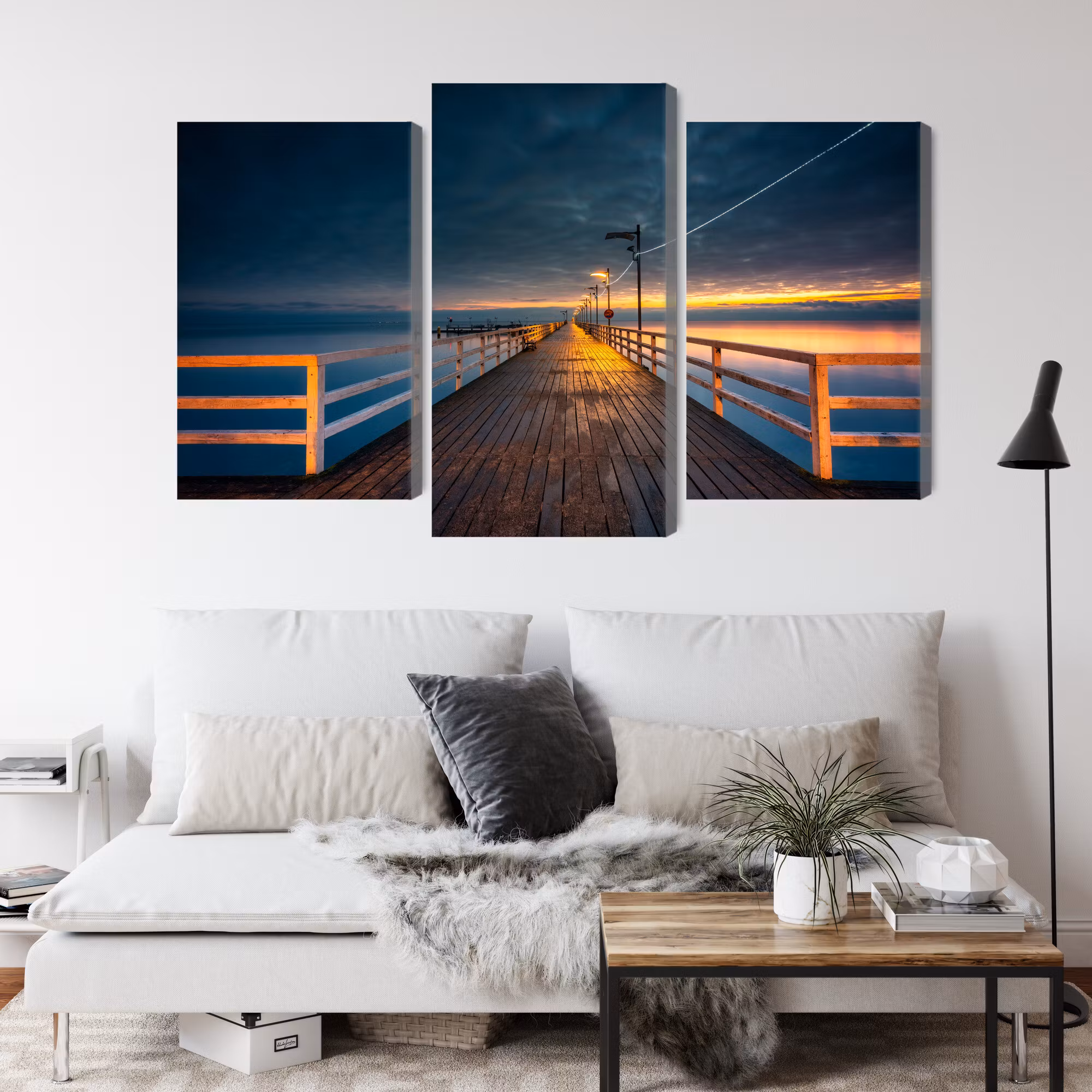 Motivet trycks runt hela ramen för ett stilrent och komplett utseende – ingen ytterram behövs. Tavlan levereras färdig att hängas upp; fäst bara ramen på en eller två skruvar. Kanttrycket gör att Evening view of the wooden pier framträder lika vackert från sidan som framifrån, och helhetsintrycket förblir lugnt och balanserat.