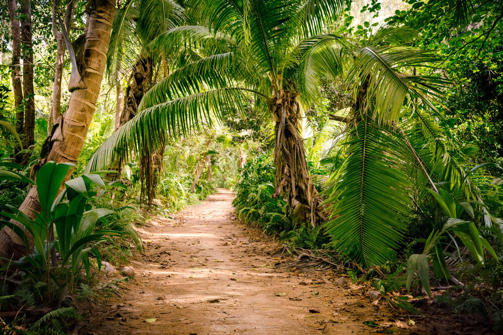 Path in a tropical 3d forest fångar ögonblicket när ljuset rör sig över landskapet. Den varma skalan ger rummet en stilla rytm och ett mjukt fokus.