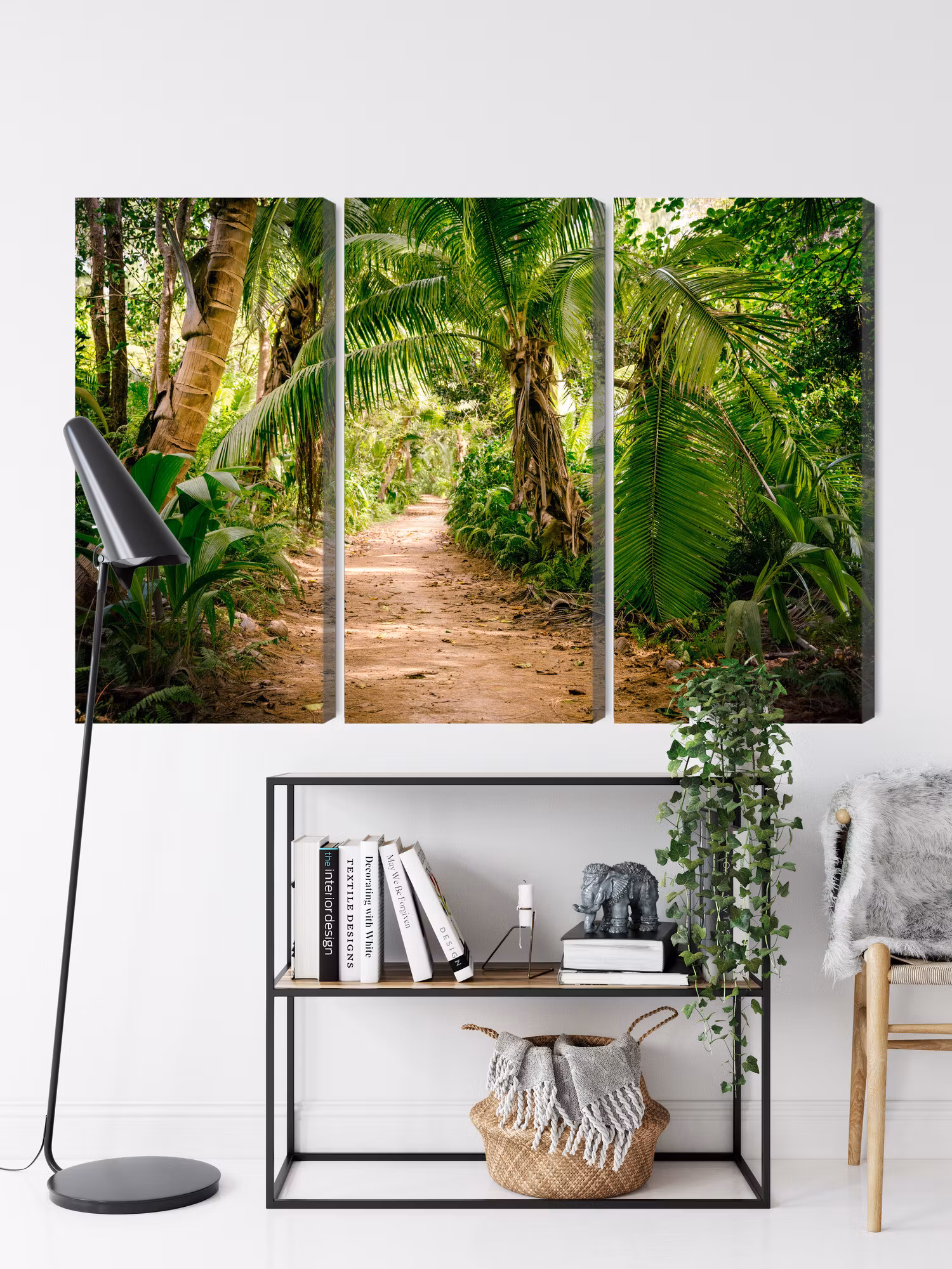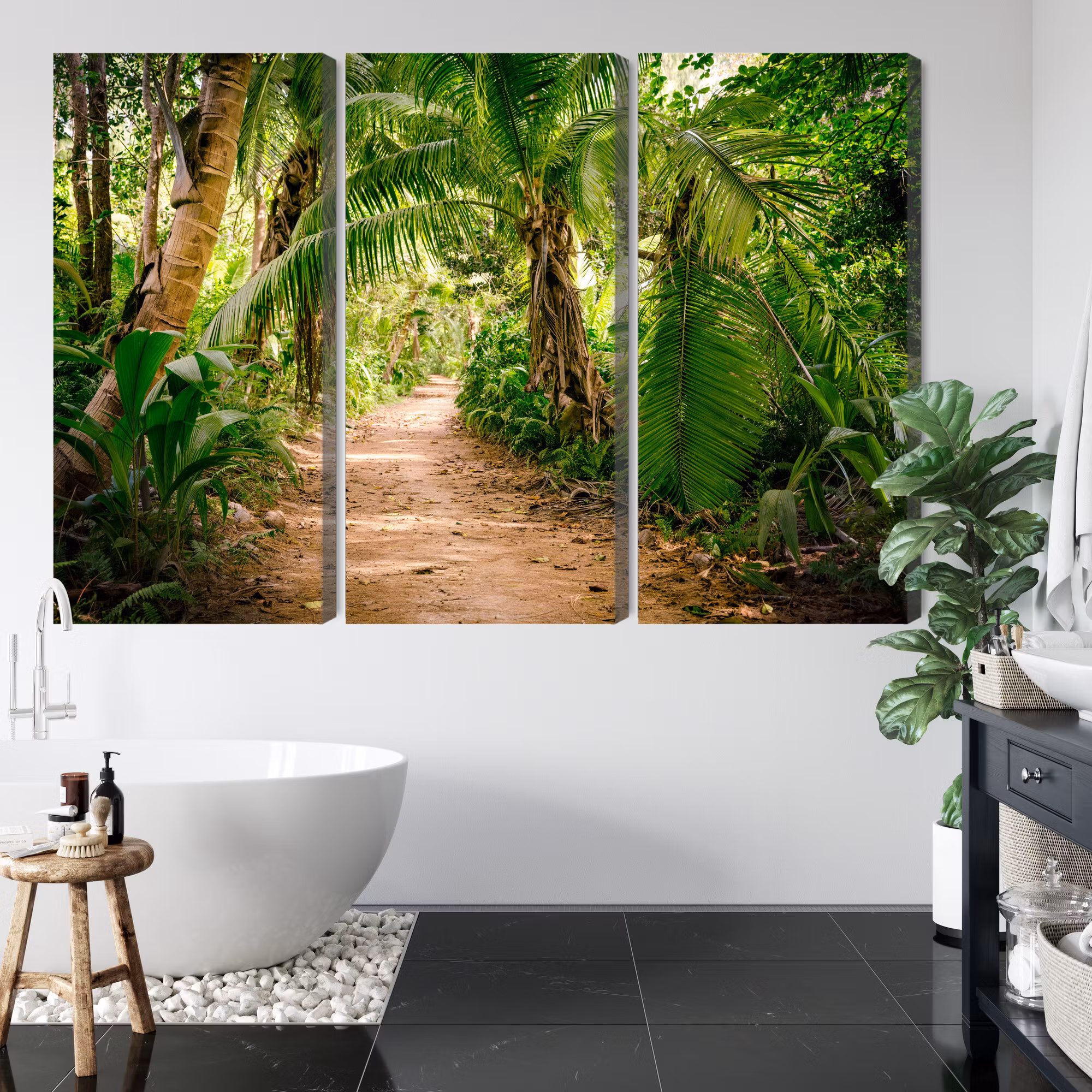 Motivet trycks runt hela ramen för ett stilrent och komplett utseende – ingen ytterram behövs. Tavlan levereras färdig att hängas upp; fäst bara ramen på en eller två skruvar. Kanttrycket gör att Path in a tropical 3d forest framträder lika vackert från sidan som framifrån, och helhetsintrycket förblir lugnt och balanserat.