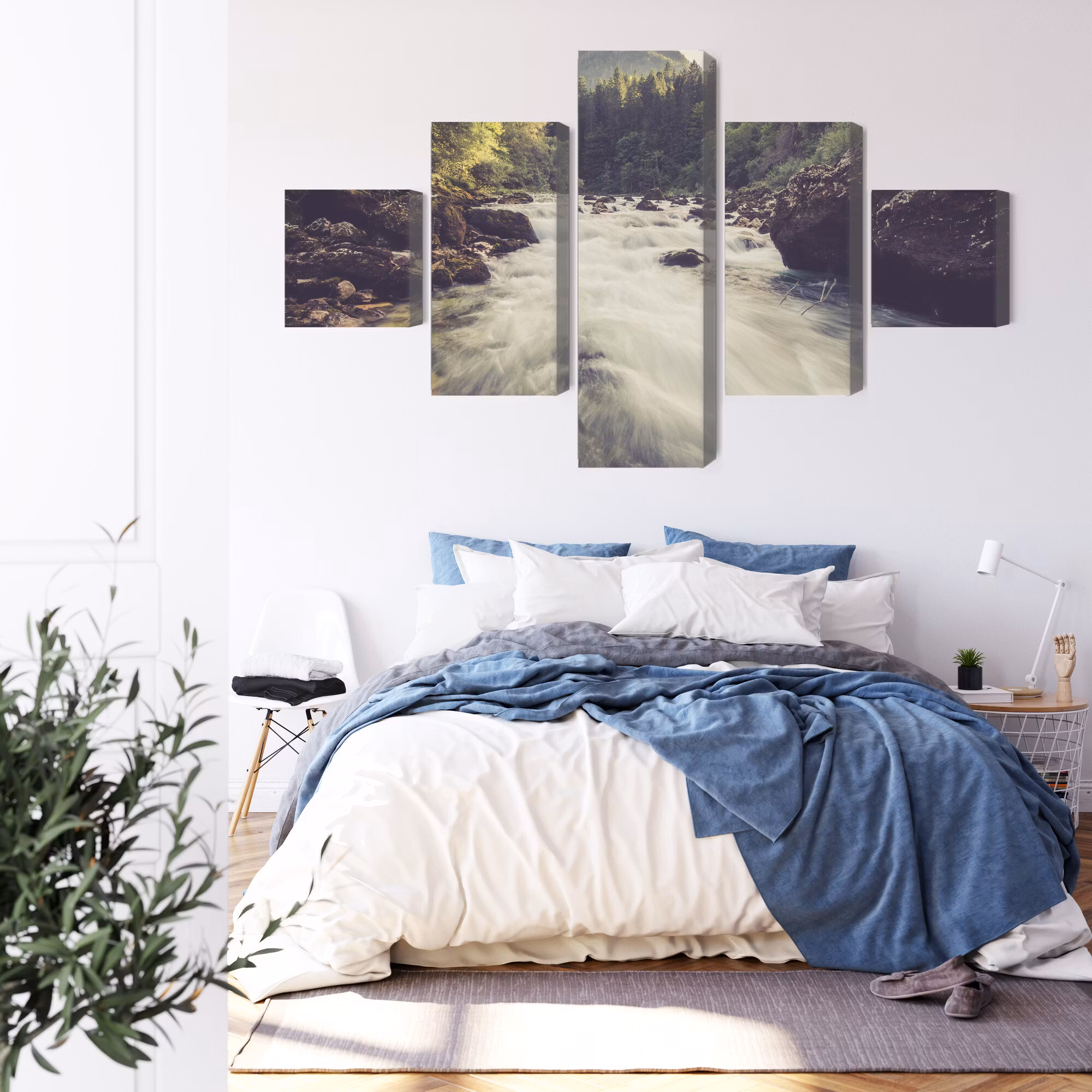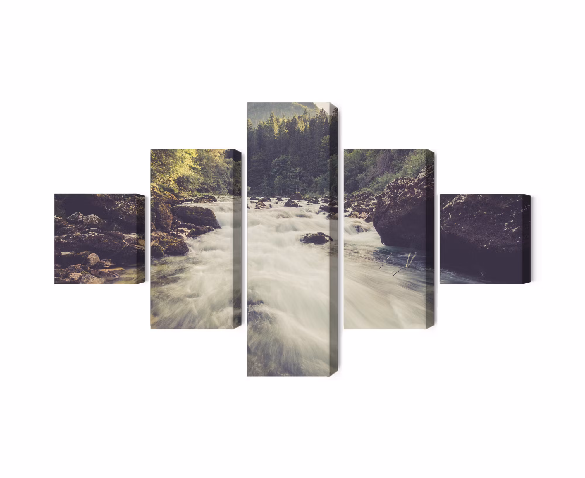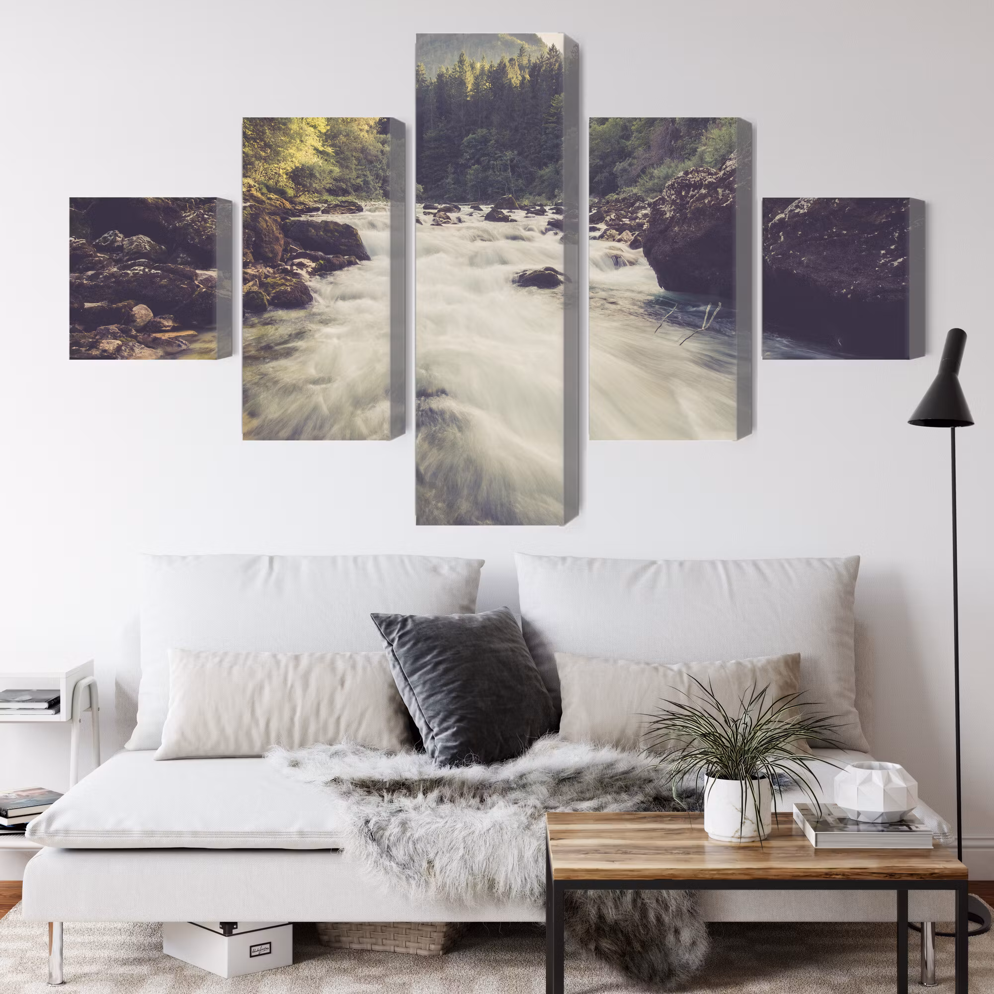 Motivet trycks runt hela ramen för ett stilrent och komplett utseende – ingen ytterram behövs. Tavlan levereras färdig att hängas upp; fäst bara ramen på en eller två skruvar. Kanttrycket gör att Mountain river in the forest framträder lika vackert från sidan som framifrån, och helhetsintrycket förblir lugnt och balanserat.