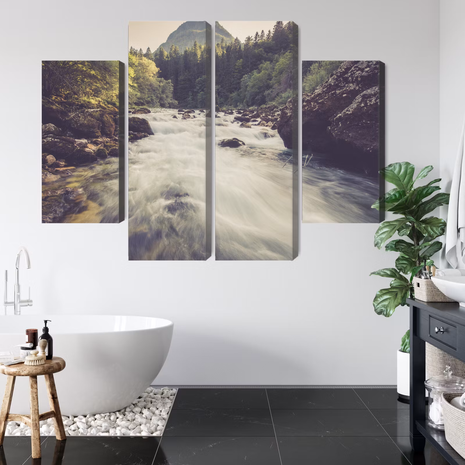 Motivet trycks runt hela ramen för ett stilrent och komplett utseende – ingen ytterram behövs. Tavlan levereras färdig att hängas upp; fäst bara ramen på en eller två skruvar. Kanttrycket gör att Mountain river in the forest framträder lika vackert från sidan som framifrån, och helhetsintrycket förblir lugnt och balanserat.
