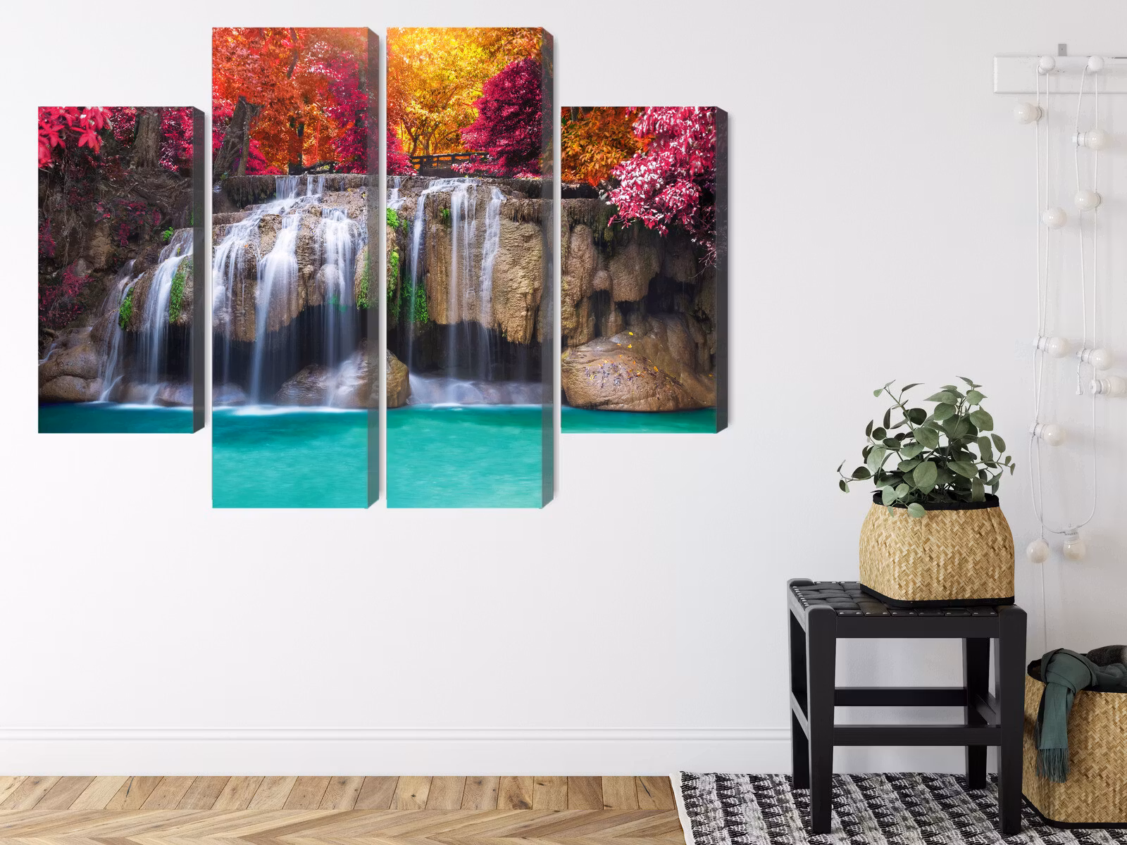 Motivet trycks runt hela ramen för ett stilrent och komplett utseende – ingen ytterram behövs. Tavlan levereras färdig att hängas upp; fäst bara ramen på en eller två skruvar. Kanttrycket gör att A waterfall in the deep forest framträder lika vackert från sidan som framifrån, och helhetsintrycket förblir lugnt och balanserat.