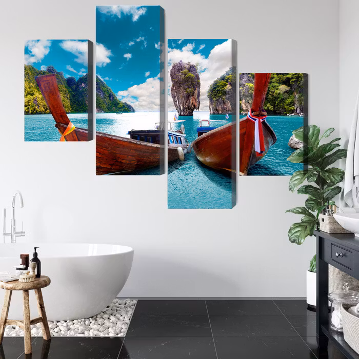 Motivet trycks runt hela ramen för ett stilrent och komplett utseende – ingen ytterram behövs. Tavlan levereras färdig att hängas upp; fäst bara ramen på en eller två skruvar. Kanttrycket gör att Boats at the andaman sea in thailand framträder lika vackert från sidan som framifrån, och helhetsintrycket förblir lugnt och balanserat.