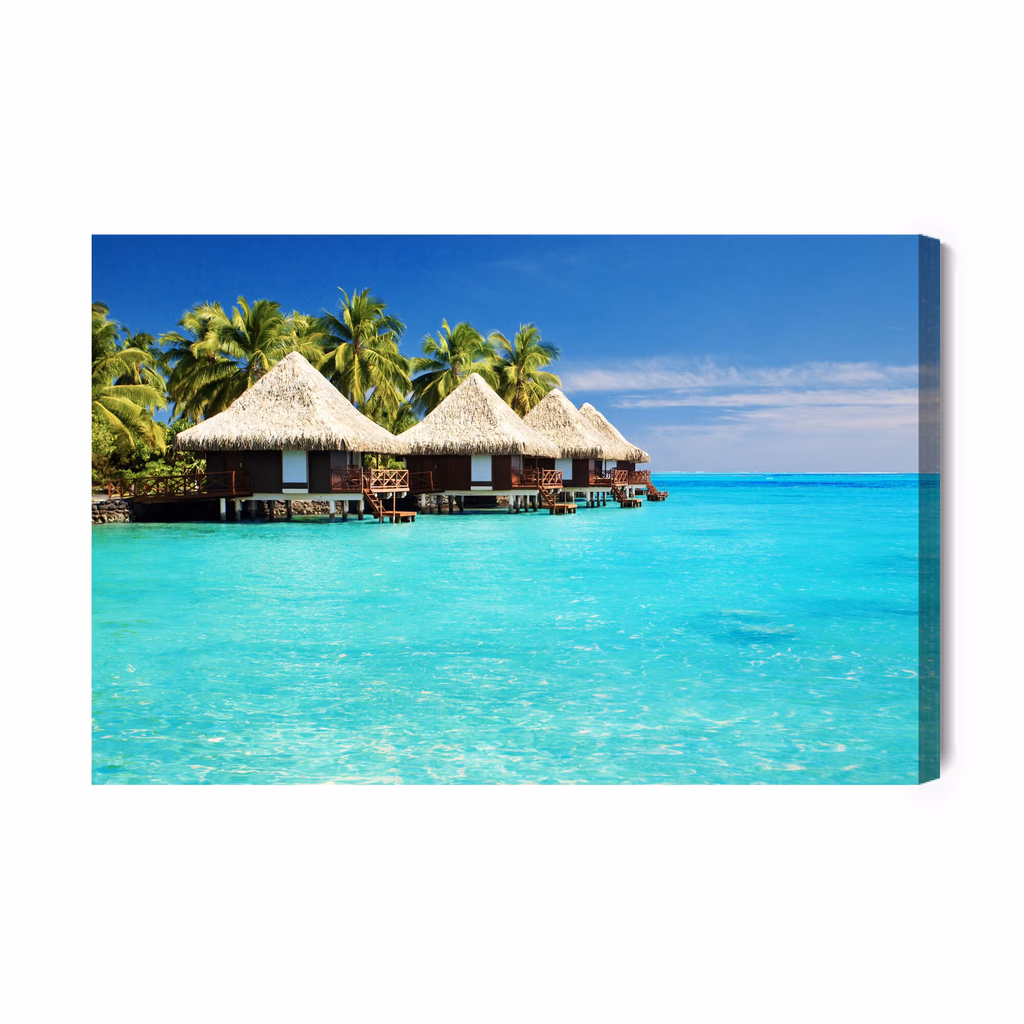Motivet trycks runt hela ramen för ett stilrent och komplett utseende – ingen ytterram behövs. Tavlan levereras färdig att hängas upp; fäst bara ramen på en eller två skruvar. Kanttrycket gör att Cottages on the seashore framträder lika vackert från sidan som framifrån, och helhetsintrycket förblir lugnt och balanserat.