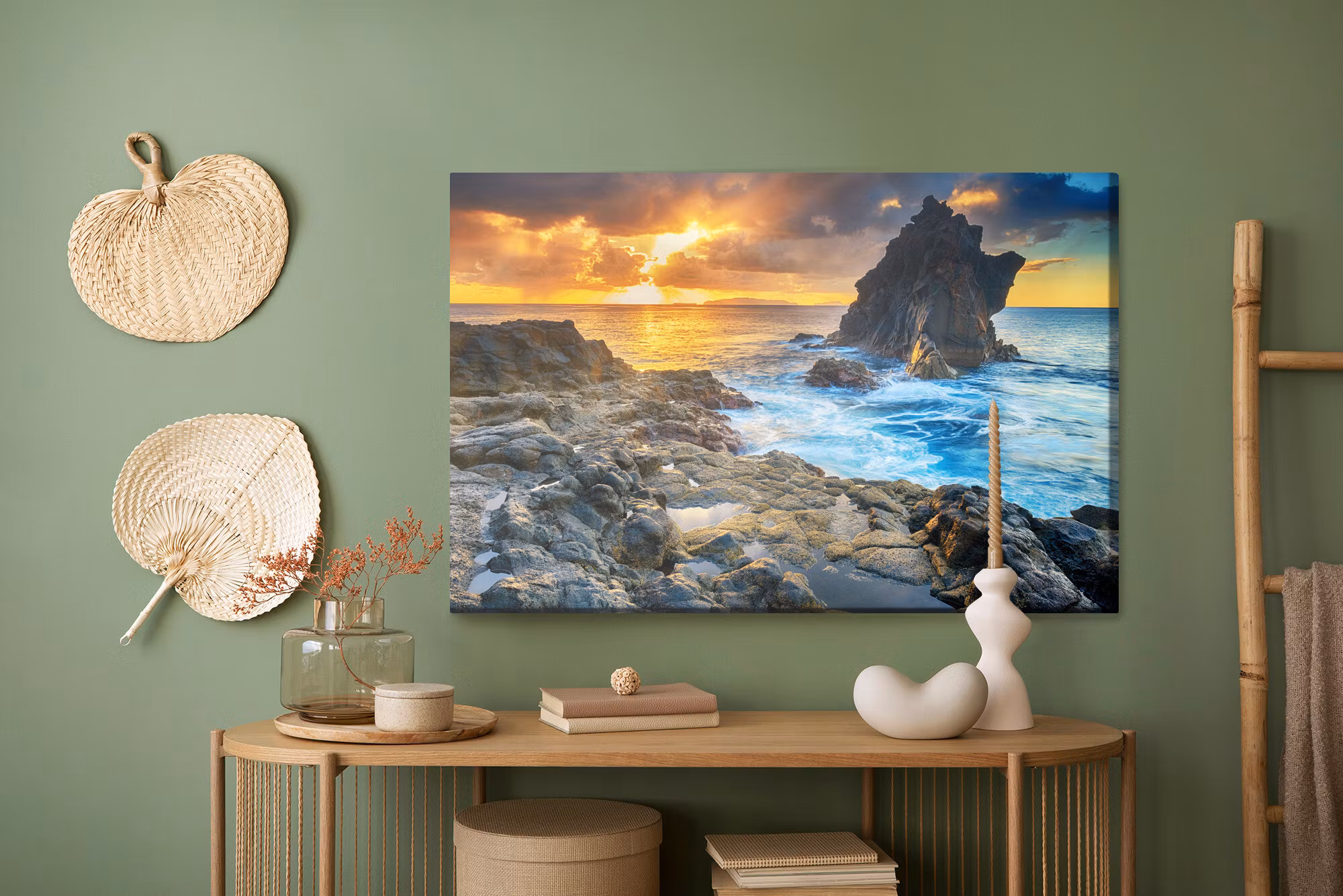 Motivet trycks runt hela ramen för ett stilrent och komplett utseende – ingen ytterram behövs. Tavlan levereras färdig att hängas upp; fäst bara ramen på en eller två skruvar. Kanttrycket gör att Sunset over the water framträder lika vackert från sidan som framifrån, och helhetsintrycket förblir lugnt och balanserat.