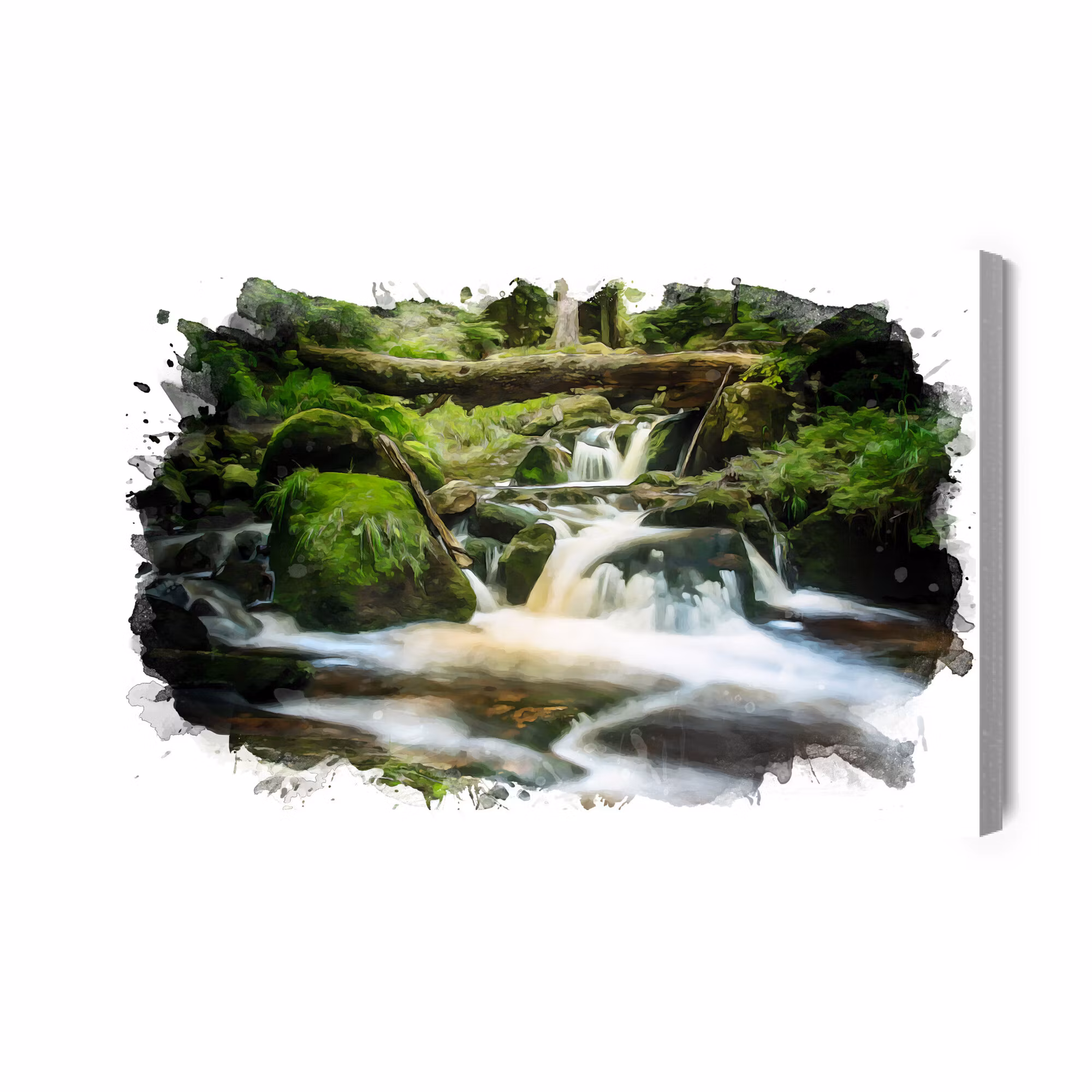 Motivet trycks runt hela ramen för ett stilrent och komplett utseende – ingen ytterram behövs. Tavlan levereras färdig att hängas upp; fäst bara ramen på en eller två skruvar. Kanttrycket gör att Waterfall in the forest painted with framträder lika vackert från sidan som framifrån, och helhetsintrycket förblir lugnt och balanserat.