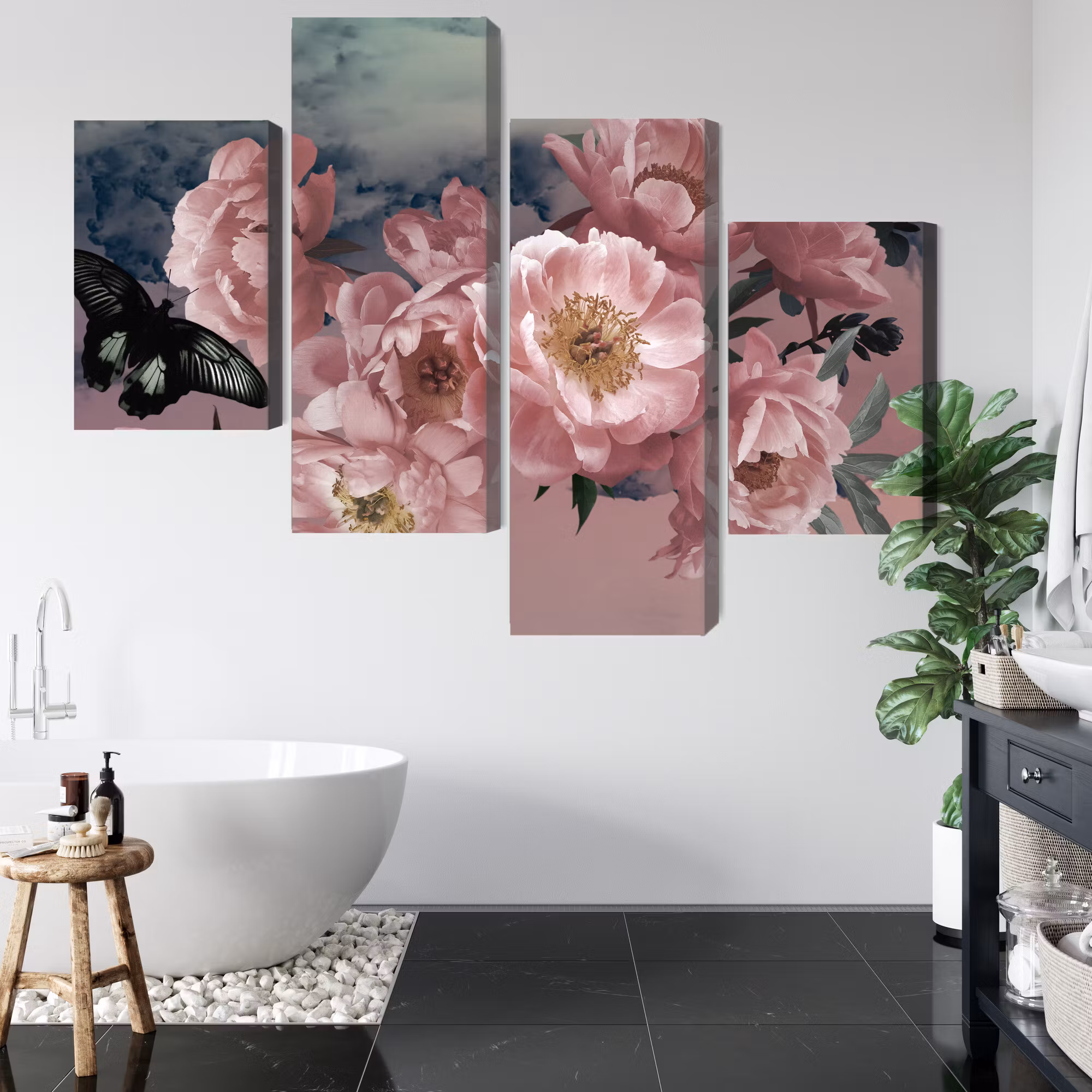 Motivet trycks runt hela ramen för ett stilrent och komplett utseende – ingen ytterram behövs. Tavlan levereras färdig att hängas upp; fäst bara ramen på en eller två skruvar. Kanttrycket gör att Bouquet of flowers and a butterfly framträder lika vackert från sidan som framifrån, och helhetsintrycket förblir lugnt och balanserat.