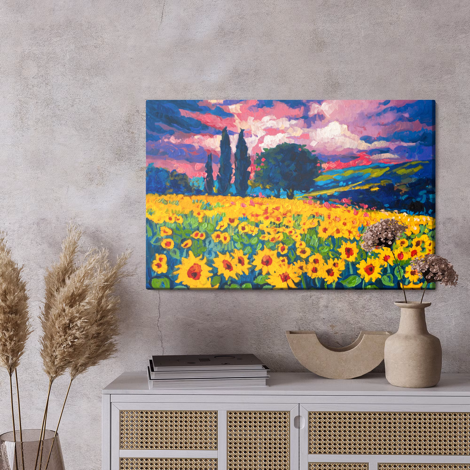 Motivet A field of sunflowers as painted förenar estetik och teknik i en harmonisk komposition, där färgtonerna är noggrant balanserade för att framhäva djup, kontrast och rytm utan att kännas skarpa. Canvasen är monterad på en stabil fururam för ett professionellt uttryck som håller över tid. Resultatet är en canvastavla som förmedlar lugn och riktning – oavsett om den hänger i vardagsrum, sovrum eller kontor. Ljuset i motivet skapar mjuka övergångar och ger en känsla av stillhet i rummet.
