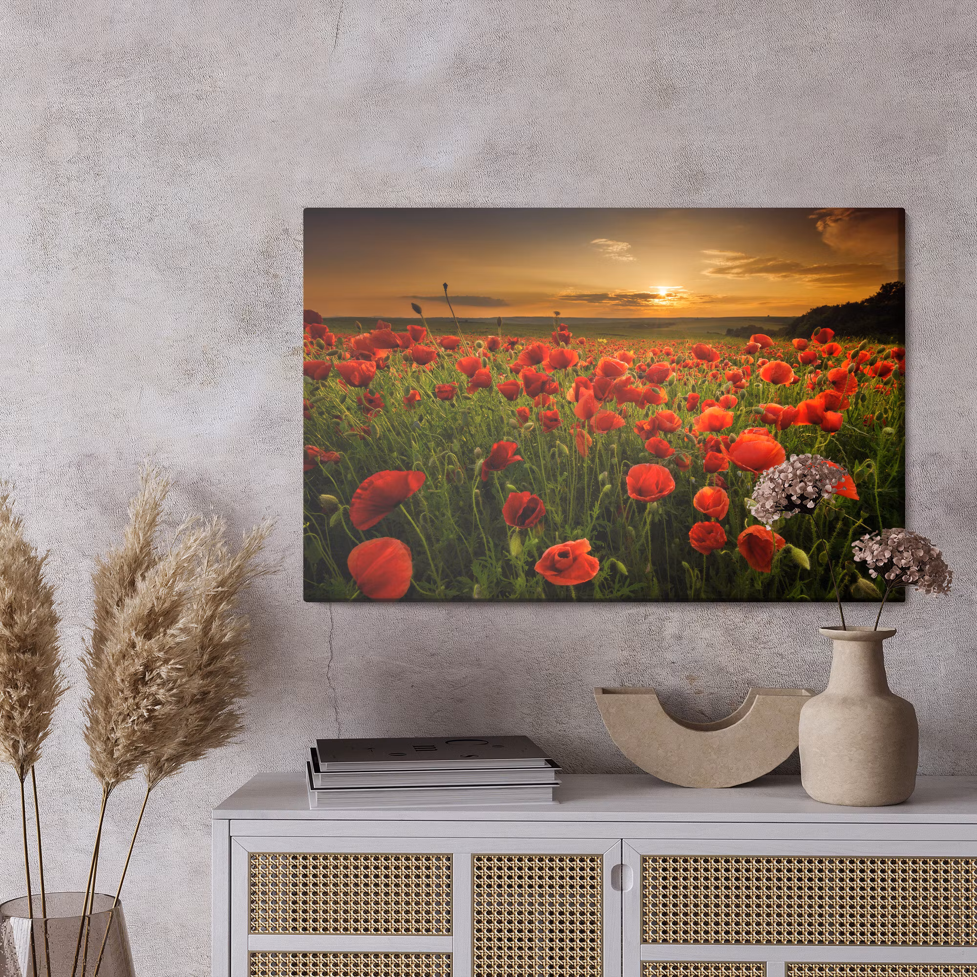 Field of poppies at sunset 3d binder samman inne och ute. Tonerna landar naturligt mot trä, linne och ljusa väggar.