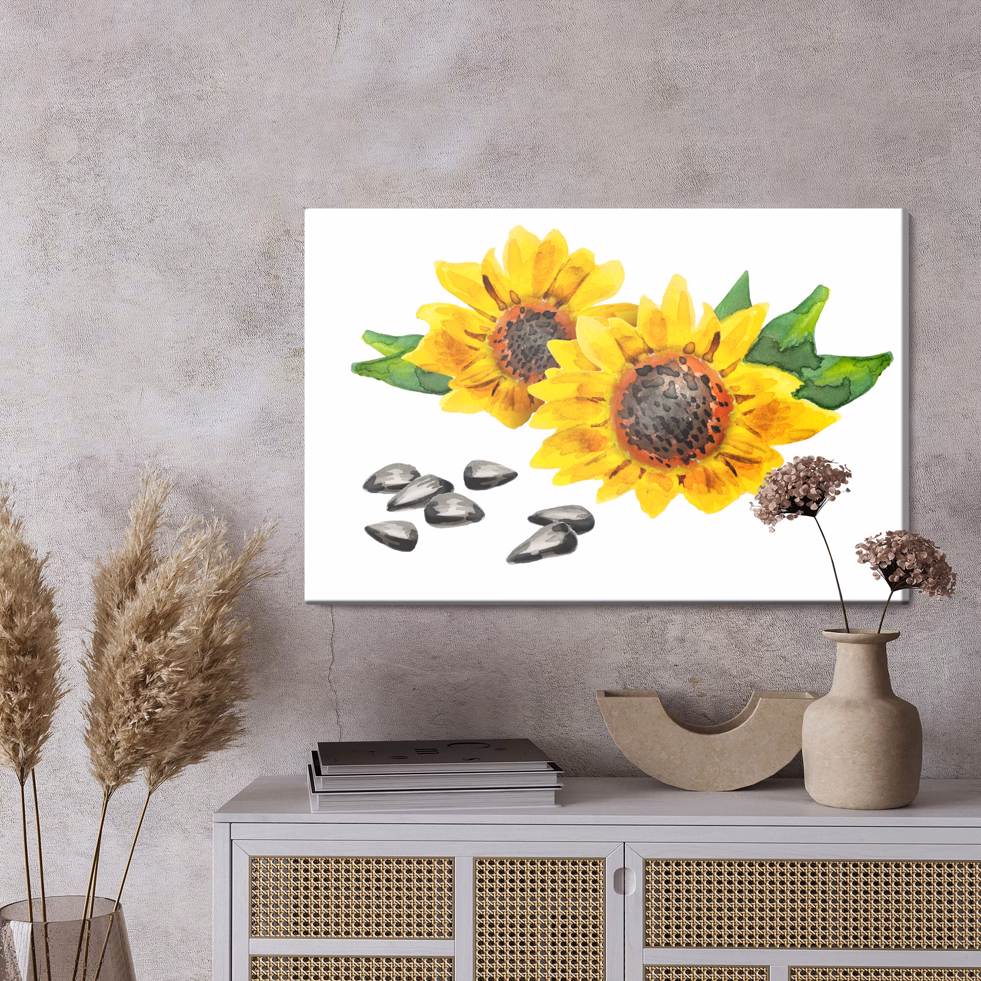 Motivet Flowers and sunflower seeds as painted förenar estetik och teknik i en harmonisk komposition, där färgtonerna är noggrant balanserade för att framhäva djup, kontrast och rytm utan att kännas skarpa. Canvasen är monterad på en stabil fururam för ett professionellt uttryck som håller över tid. Resultatet är en canvastavla som förmedlar lugn och riktning – oavsett om den hänger i vardagsrum, sovrum eller kontor. Ljuset i motivet skapar mjuka övergångar och ger en känsla av stillhet i rummet.