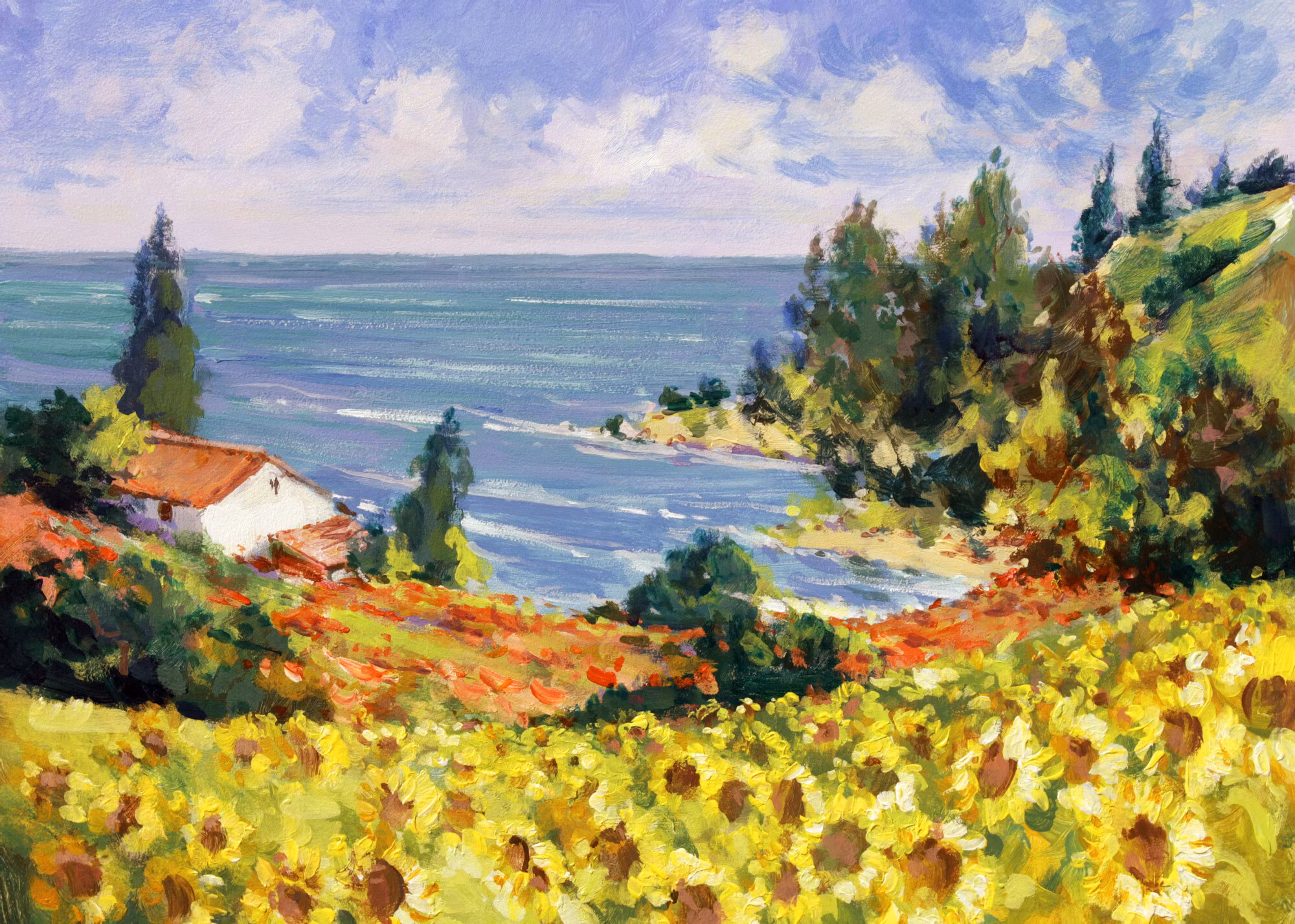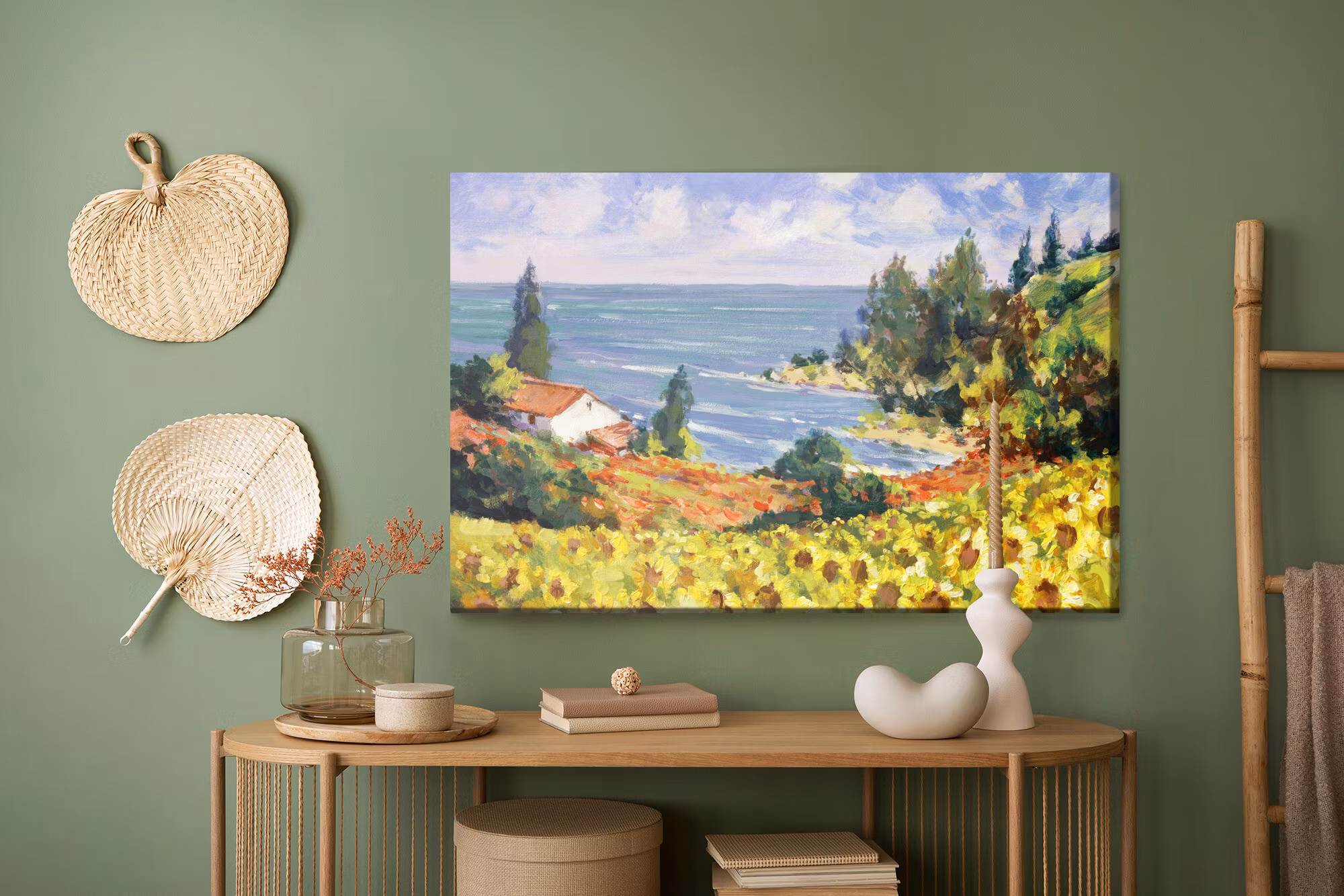 Motivet Landscape with sunflowers as painted förenar estetik och teknik i en harmonisk komposition, där färgtonerna är noggrant balanserade för att framhäva djup, kontrast och rytm utan att kännas skarpa. Canvasen är monterad på en stabil fururam för ett professionellt uttryck som håller över tid. Resultatet är en canvastavla som förmedlar lugn och riktning – oavsett om den hänger i vardagsrum, sovrum eller kontor. Ljuset i motivet skapar mjuka övergångar och ger en känsla av stillhet i rummet.