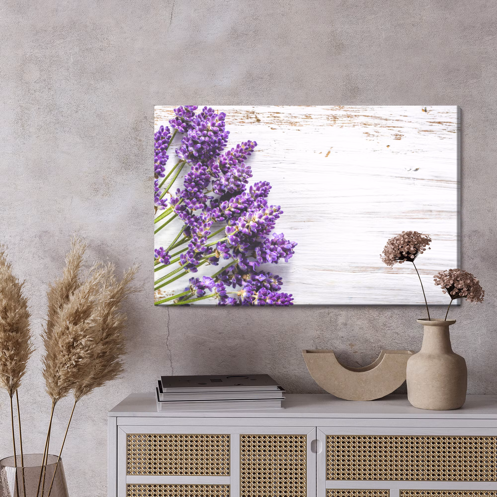 Motivet Lavender flowers on a wood background förenar estetik och teknik i en harmonisk komposition, där färgtonerna är noggrant balanserade för att framhäva djup, kontrast och rytm utan att kännas skarpa. Canvasen är monterad på en stabil fururam för ett professionellt uttryck som håller över tid. Resultatet är en canvastavla som förmedlar lugn och riktning – oavsett om den hänger i vardagsrum, sovrum eller kontor. Ljuset i motivet skapar mjuka övergångar och ger en känsla av stillhet i rummet.