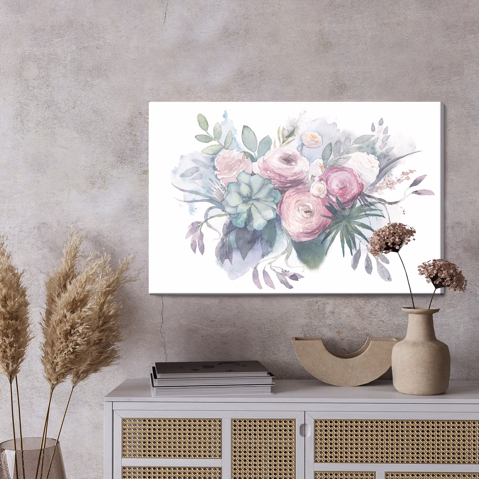 Motivet Pastel flowers painted with watercolor förenar estetik och teknik i en harmonisk komposition, där färgtonerna är noggrant balanserade för att framhäva djup, kontrast och rytm utan att kännas skarpa. Canvasen är monterad på en stabil fururam för ett professionellt uttryck som håller över tid. Resultatet är en canvastavla som förmedlar lugn och riktning – oavsett om den hänger i vardagsrum, sovrum eller kontor. Ljuset i motivet skapar mjuka övergångar och ger en känsla av stillhet i rummet.