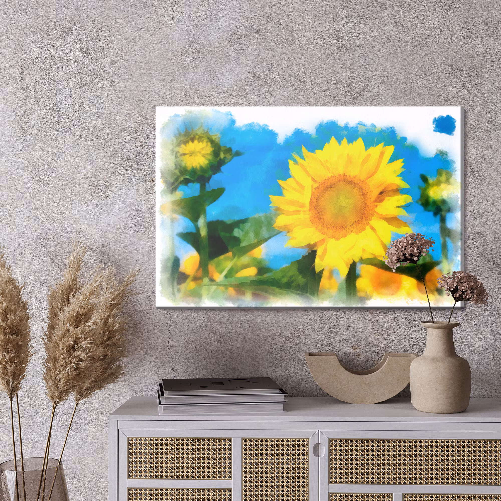 Motivet Sunflowers as if painted with watercolor förenar estetik och teknik i en harmonisk komposition, där färgtonerna är noggrant balanserade för att framhäva djup, kontrast och rytm utan att kännas skarpa. Canvasen är monterad på en stabil fururam för ett professionellt uttryck som håller över tid. Resultatet är en canvastavla som förmedlar lugn och riktning – oavsett om den hänger i vardagsrum, sovrum eller kontor. Ljuset i motivet skapar mjuka övergångar och ger en känsla av stillhet i rummet.