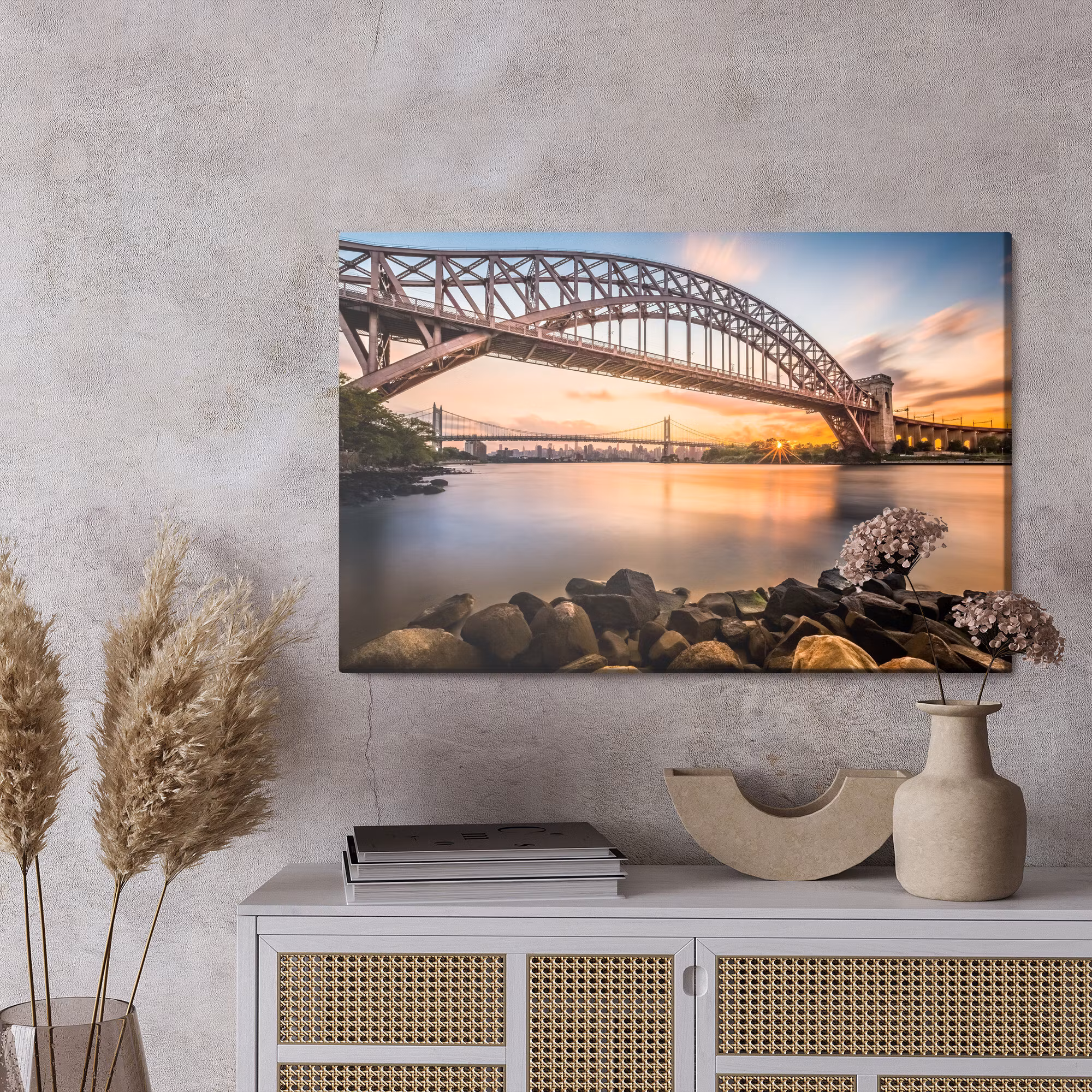 Motivet trycks runt hela ramen för ett stilrent och komplett utseende – ingen ytterram behövs. Tavlan levereras färdig att hängas upp; fäst bara ramen på en eller två skruvar. Kanttrycket gör att Hell gate bridge, new york framträder lika vackert från sidan som framifrån, och helhetsintrycket förblir lugnt och balanserat.