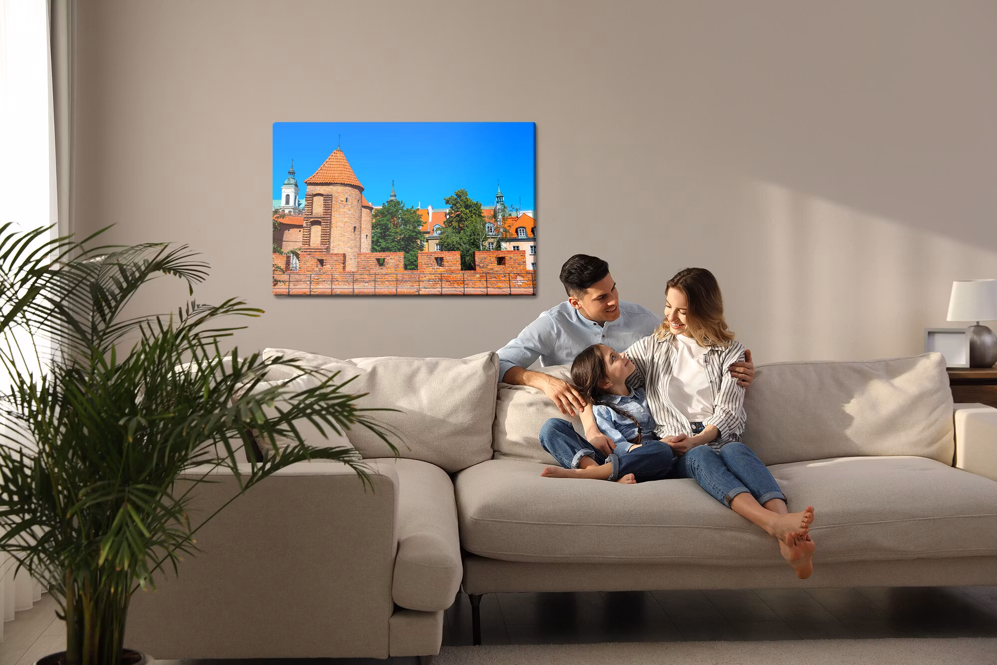 Motivet trycks runt hela ramen för ett stilrent och komplett utseende – ingen ytterram behövs. Tavlan levereras färdig att hängas upp; fäst bara ramen på en eller två skruvar. Kanttrycket gör att Old walls in warsaw framträder lika vackert från sidan som framifrån, och helhetsintrycket förblir lugnt och balanserat.