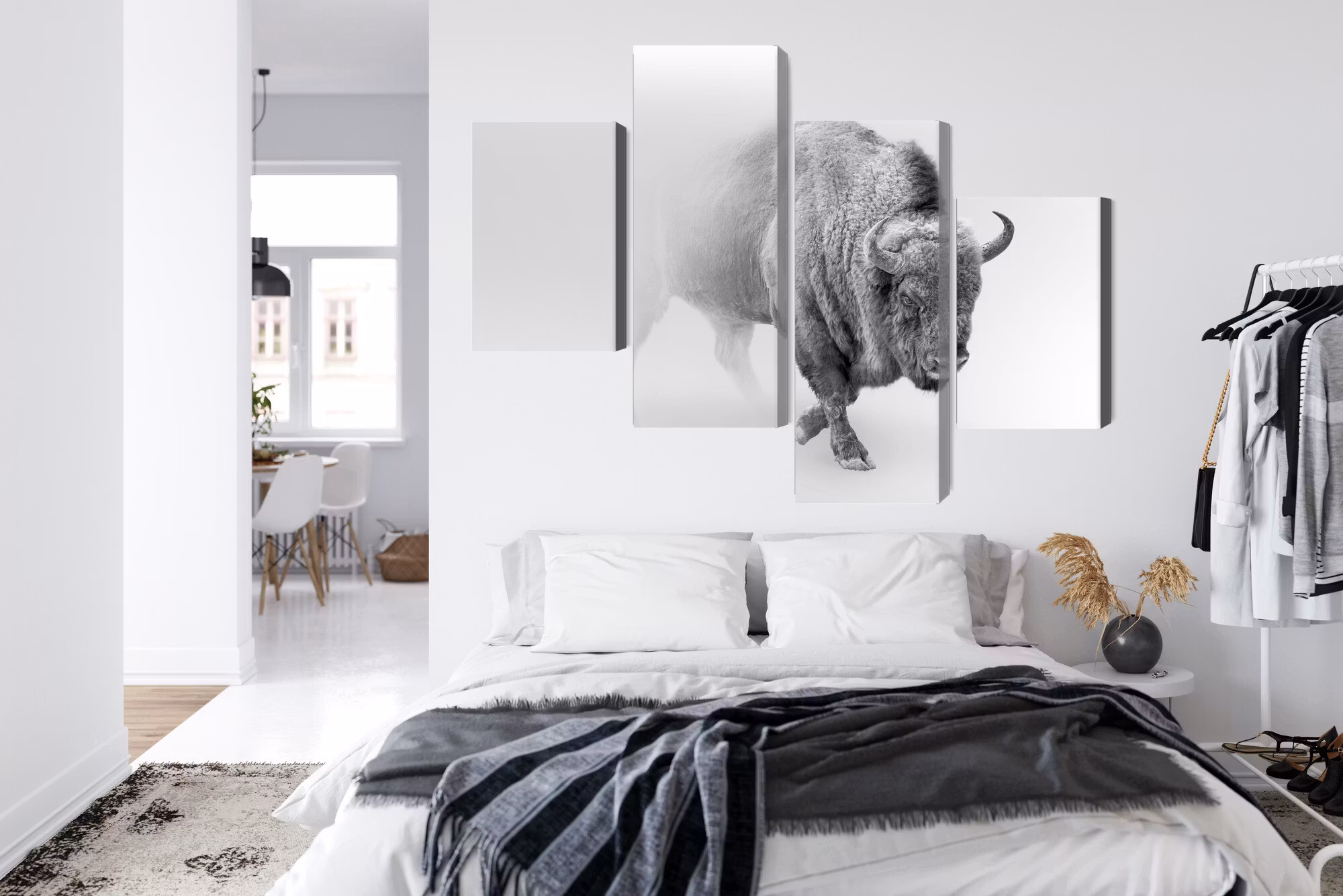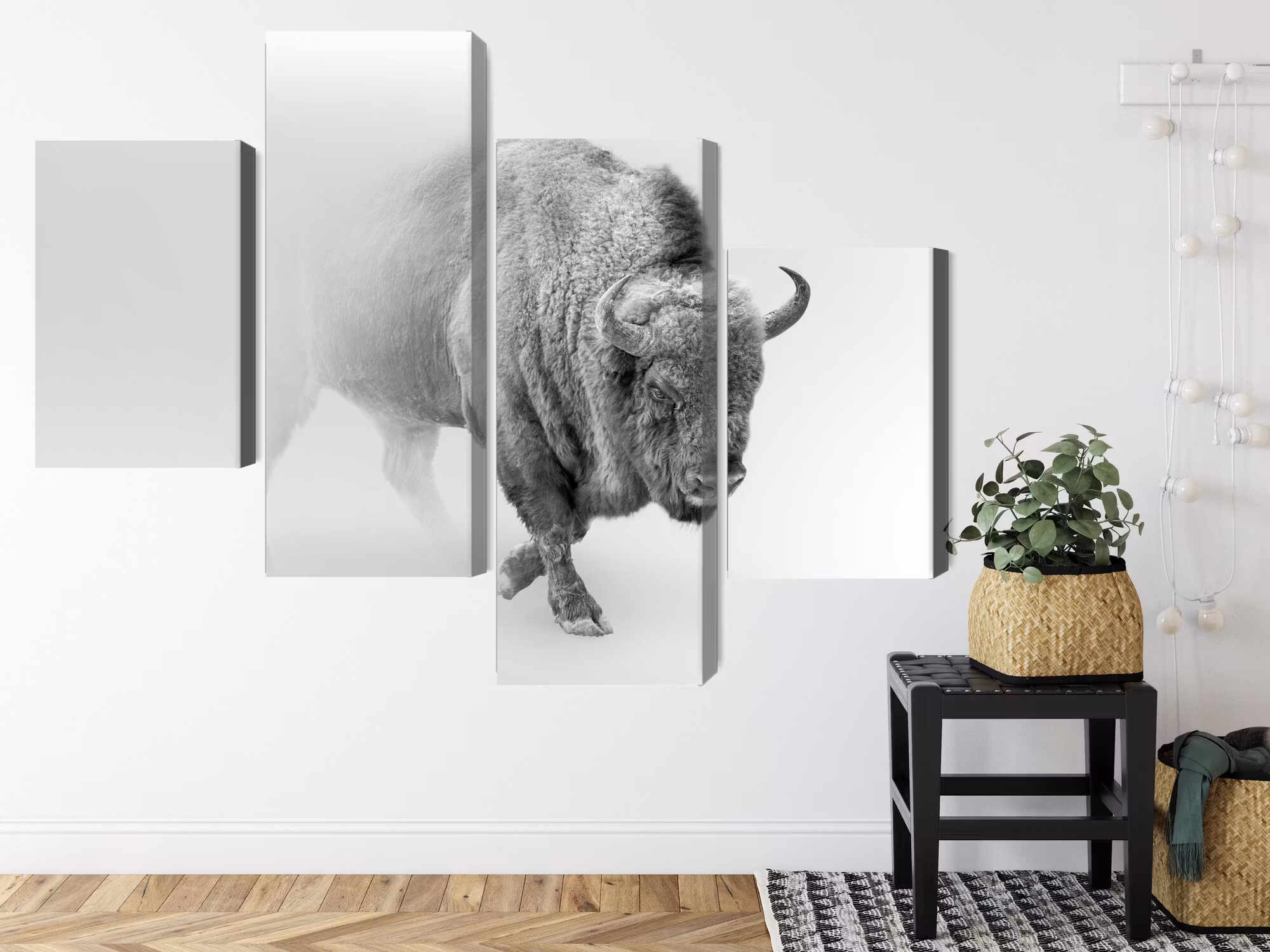 Motivet trycks runt hela ramen för ett stilrent och komplett utseende – ingen ytterram behövs. Tavlan levereras färdig att hängas upp; fäst bara ramen på en eller två skruvar. Kanttrycket gör att Bison in the fog 3d framträder lika vackert från sidan som framifrån, och helhetsintrycket förblir lugnt och balanserat.