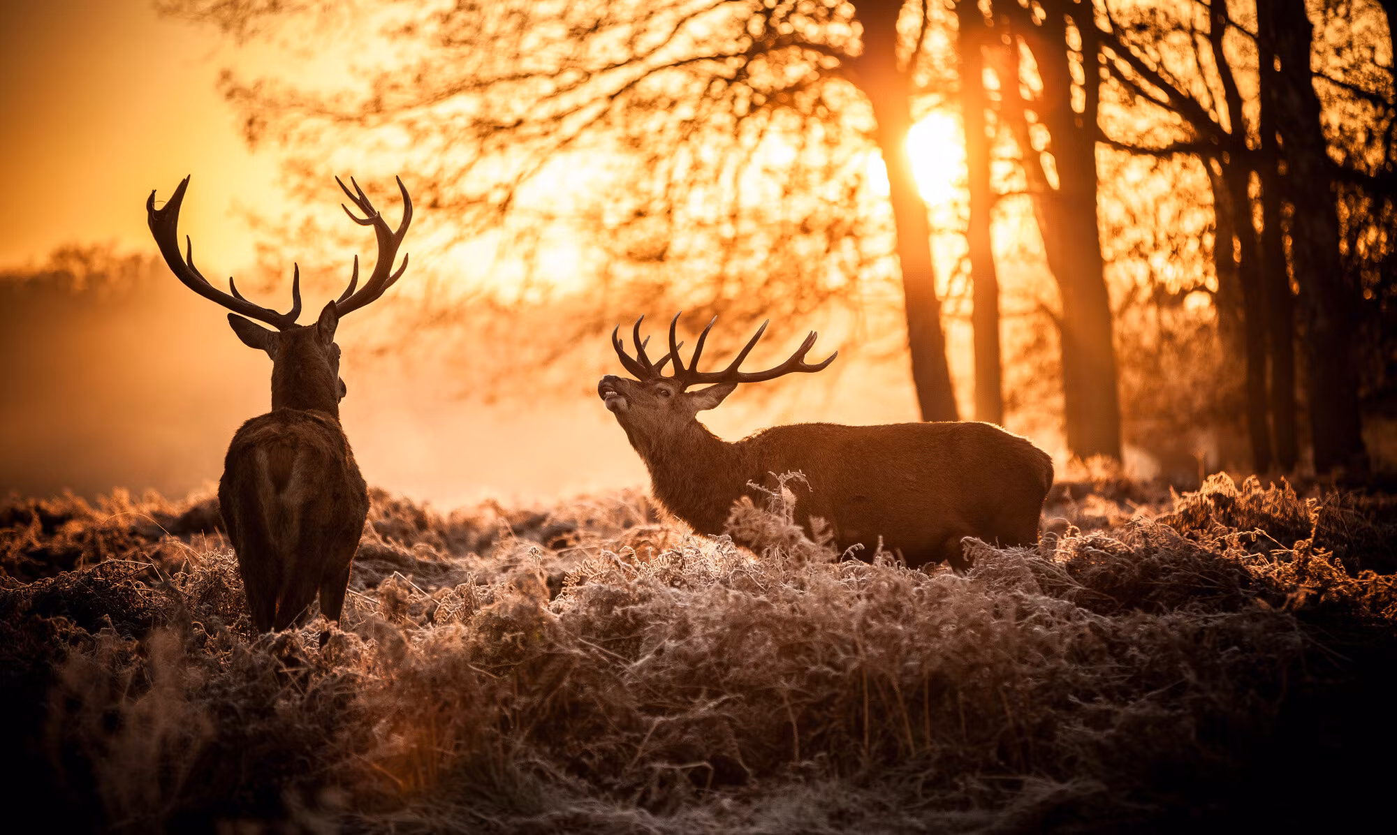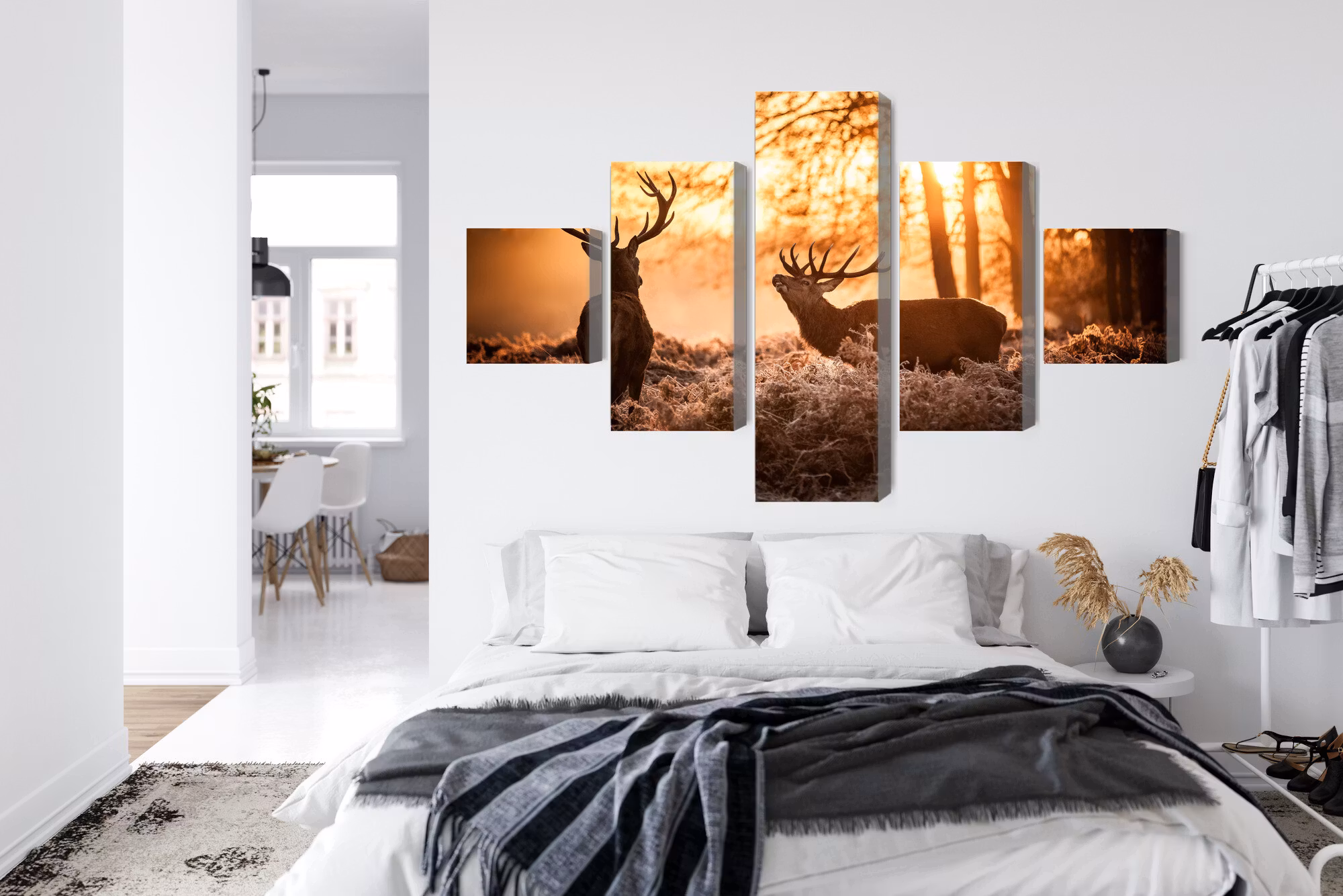 Lugna nyanser i Two deer in the forest at sunset 3d skapar en vilopunkt där blicken kan stanna utan att rummet känns tungt.
