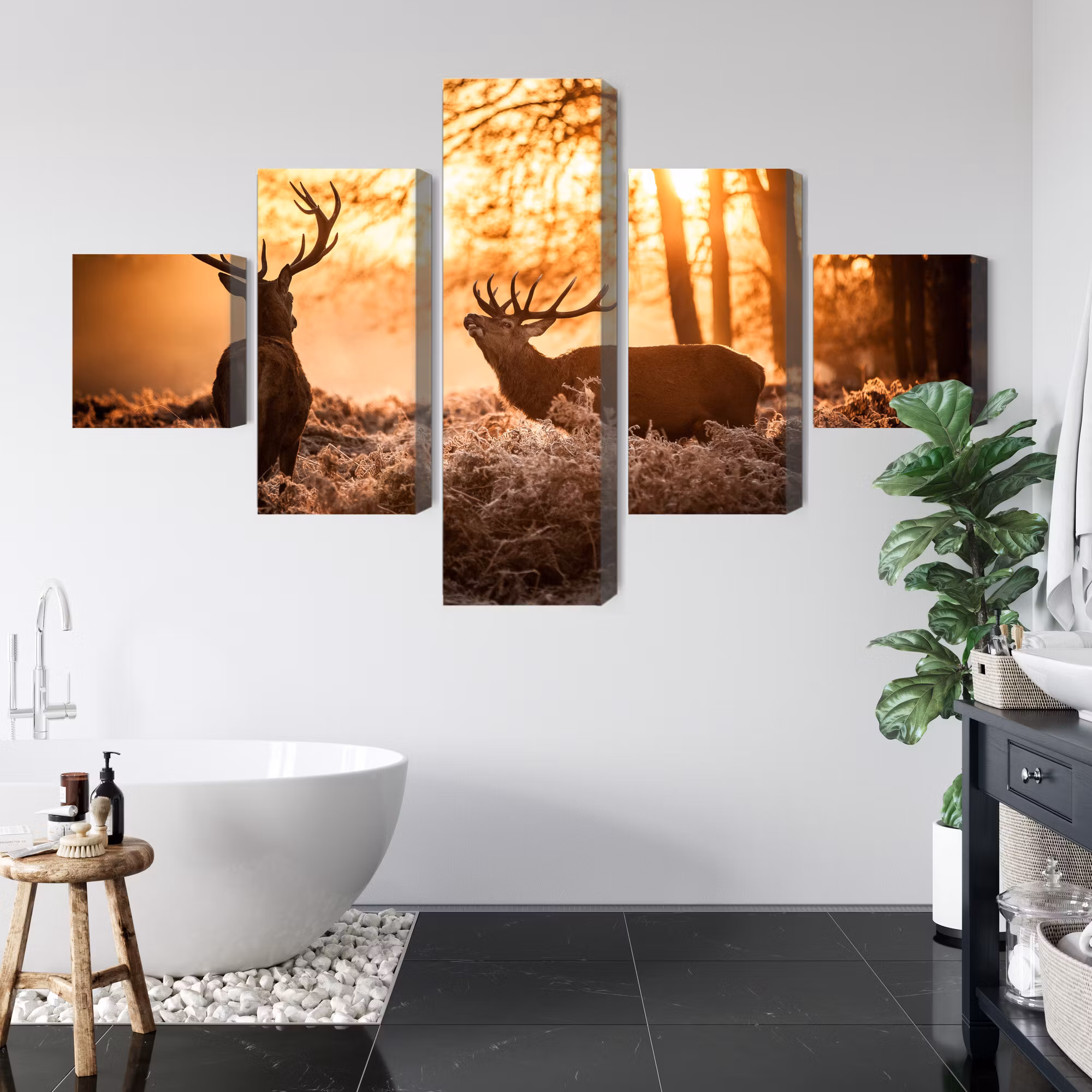 Canvastavlan Two deer in the forest at sunset 3d finns i två varianter beroende på vilken känsla du vill skapa.