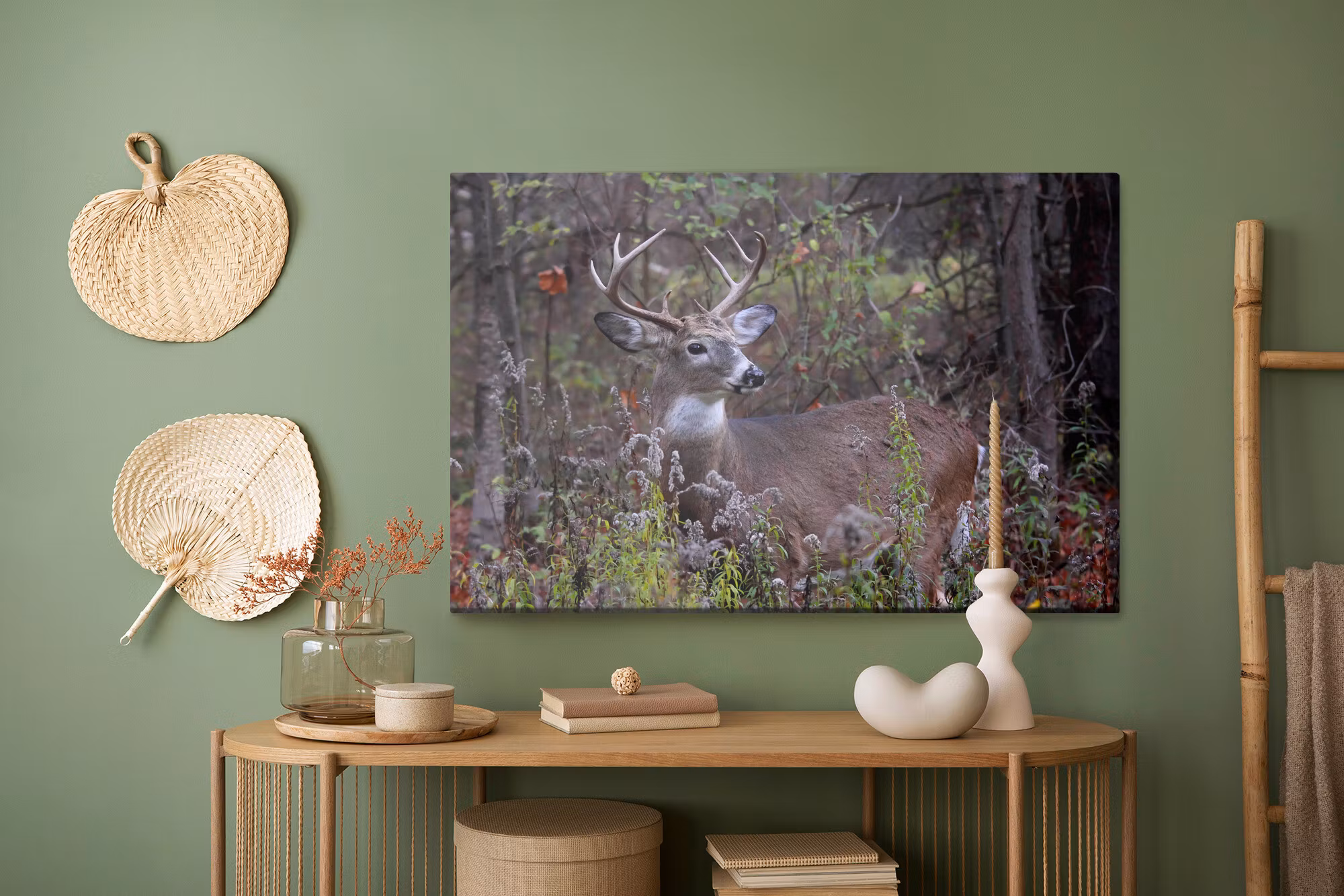 Motivet trycks runt hela ramen för ett stilrent och komplett utseende – ingen ytterram behövs. Tavlan levereras färdig att hängas upp; fäst bara ramen på en eller två skruvar. Kanttrycket gör att A deer among the forest vegetation framträder lika vackert från sidan som framifrån, och helhetsintrycket förblir lugnt och balanserat.