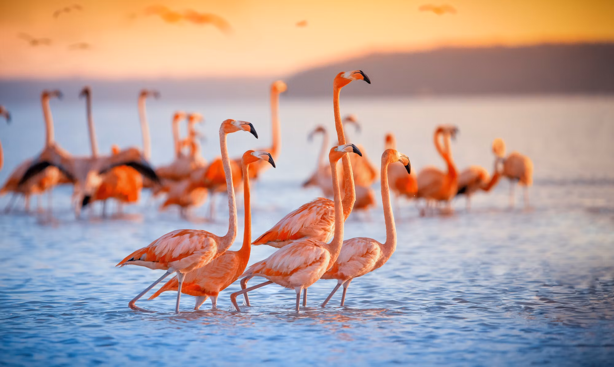 A flock of flamingos by the water fångar ögonblicket när ljuset rör sig över landskapet. Den varma skalan ger rummet en stilla rytm och ett mjukt fokus.