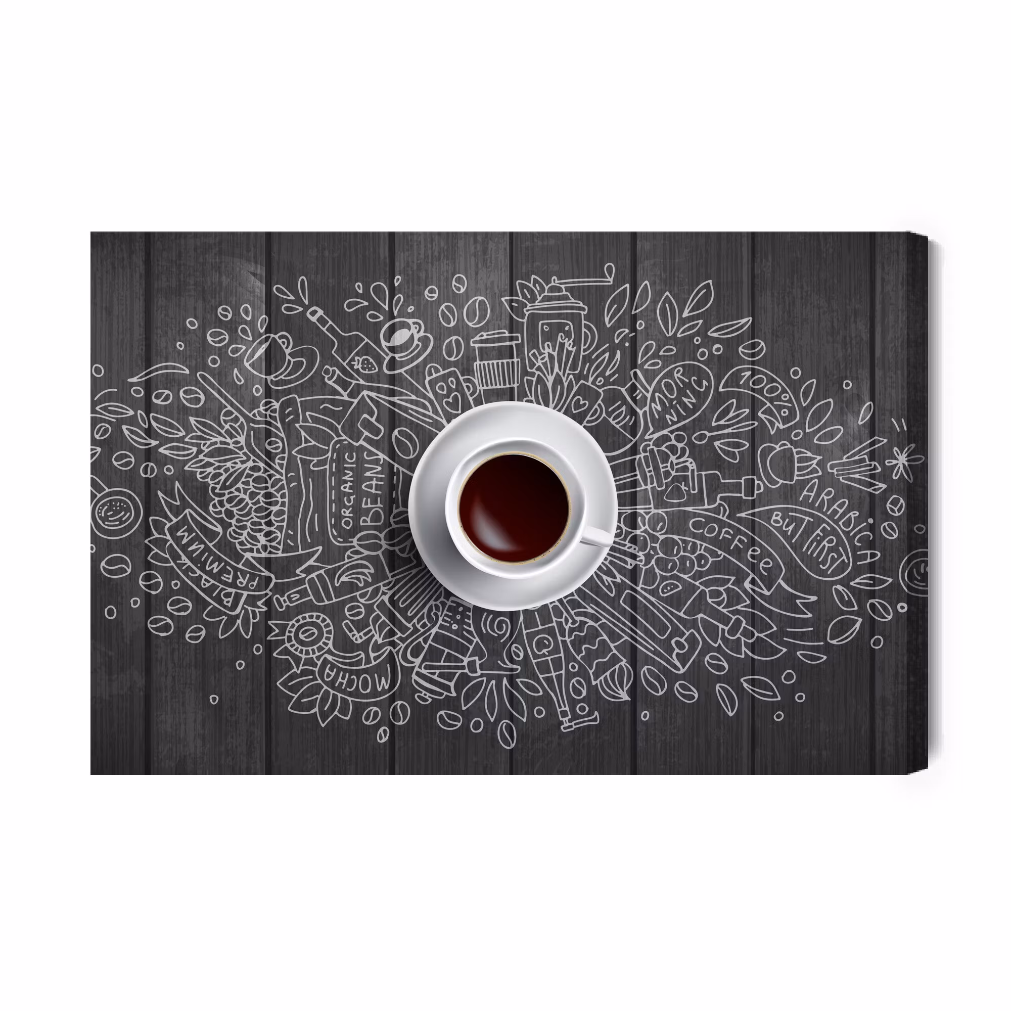 Motivet trycks runt hela ramen för ett stilrent och komplett utseende – ingen ytterram behövs. Tavlan levereras färdig att hängas upp; fäst bara ramen på en eller två skruvar. Kanttrycket gör att White cup of coffee framträder lika vackert från sidan som framifrån, och helhetsintrycket förblir lugnt och balanserat.