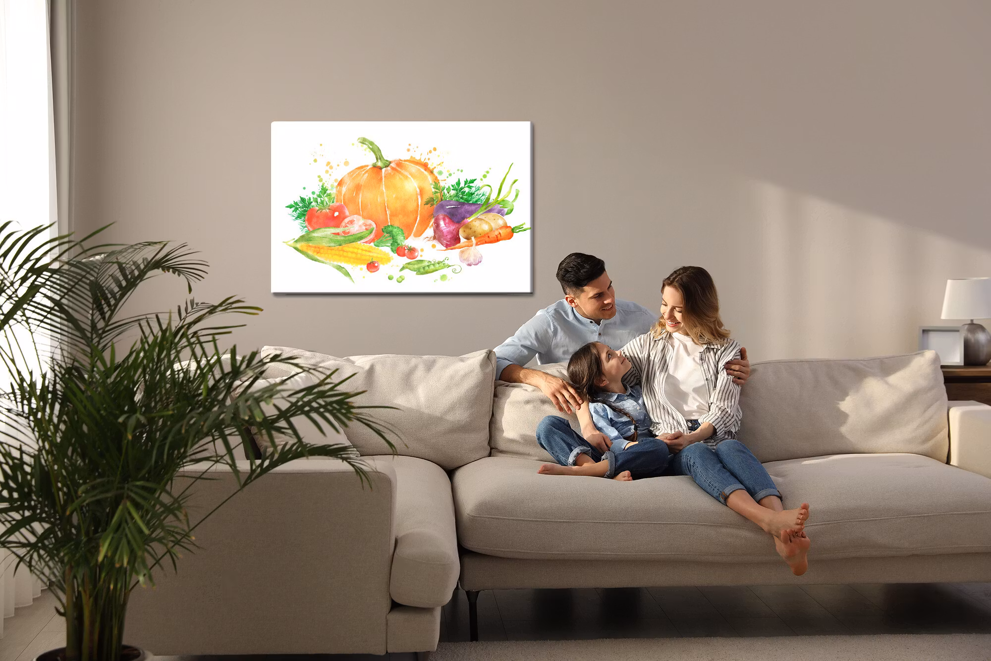 Motivet trycks runt hela ramen för ett stilrent och komplett utseende – ingen ytterram behövs. Tavlan levereras färdig att hängas upp; fäst bara ramen på en eller två skruvar. Kanttrycket gör att Pumpkin with vegetables framträder lika vackert från sidan som framifrån, och helhetsintrycket förblir lugnt och balanserat.
