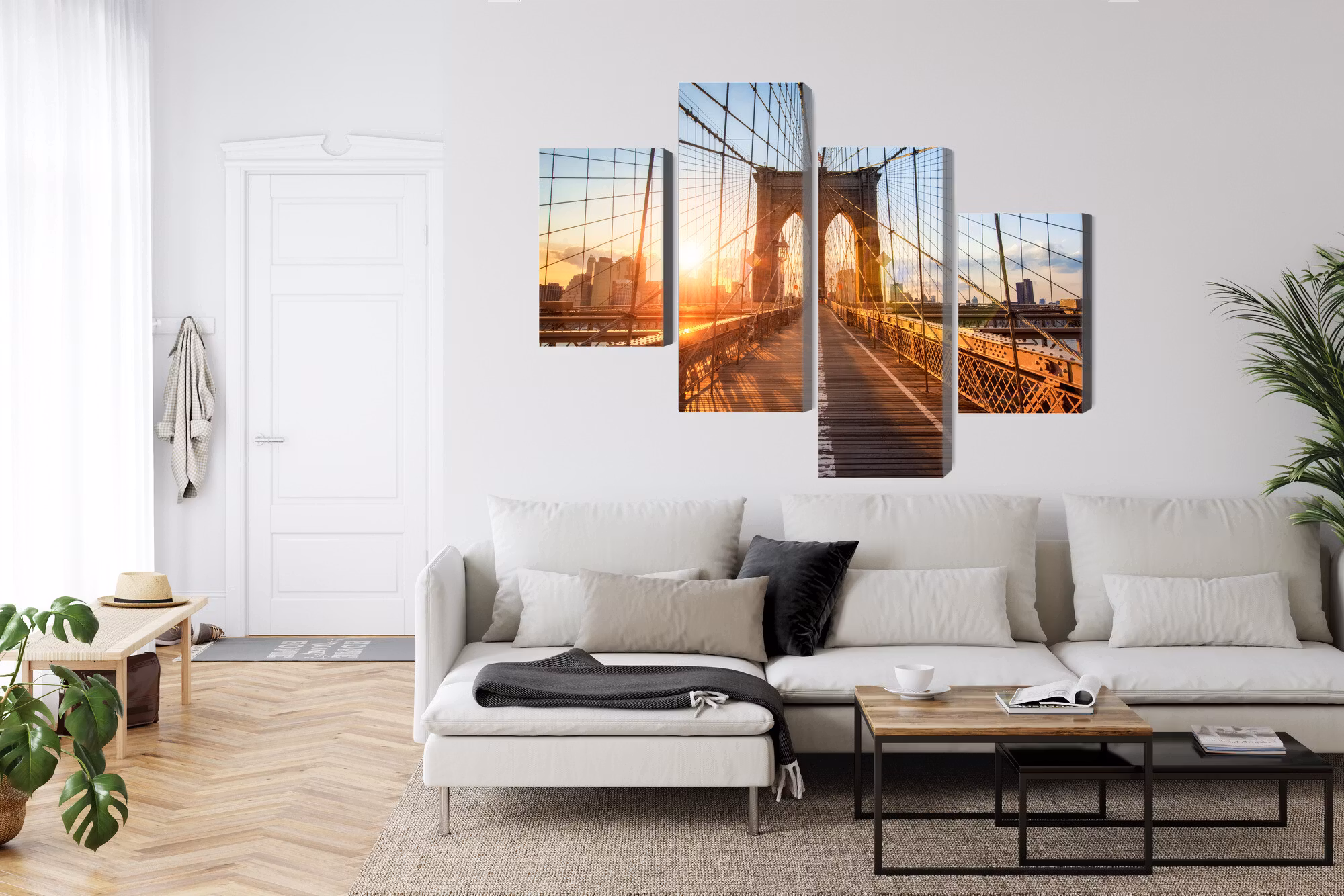Med Brooklyn bridge in new york får du ett urbant ankare som samspelar med rena linjer och monokroma ytor.