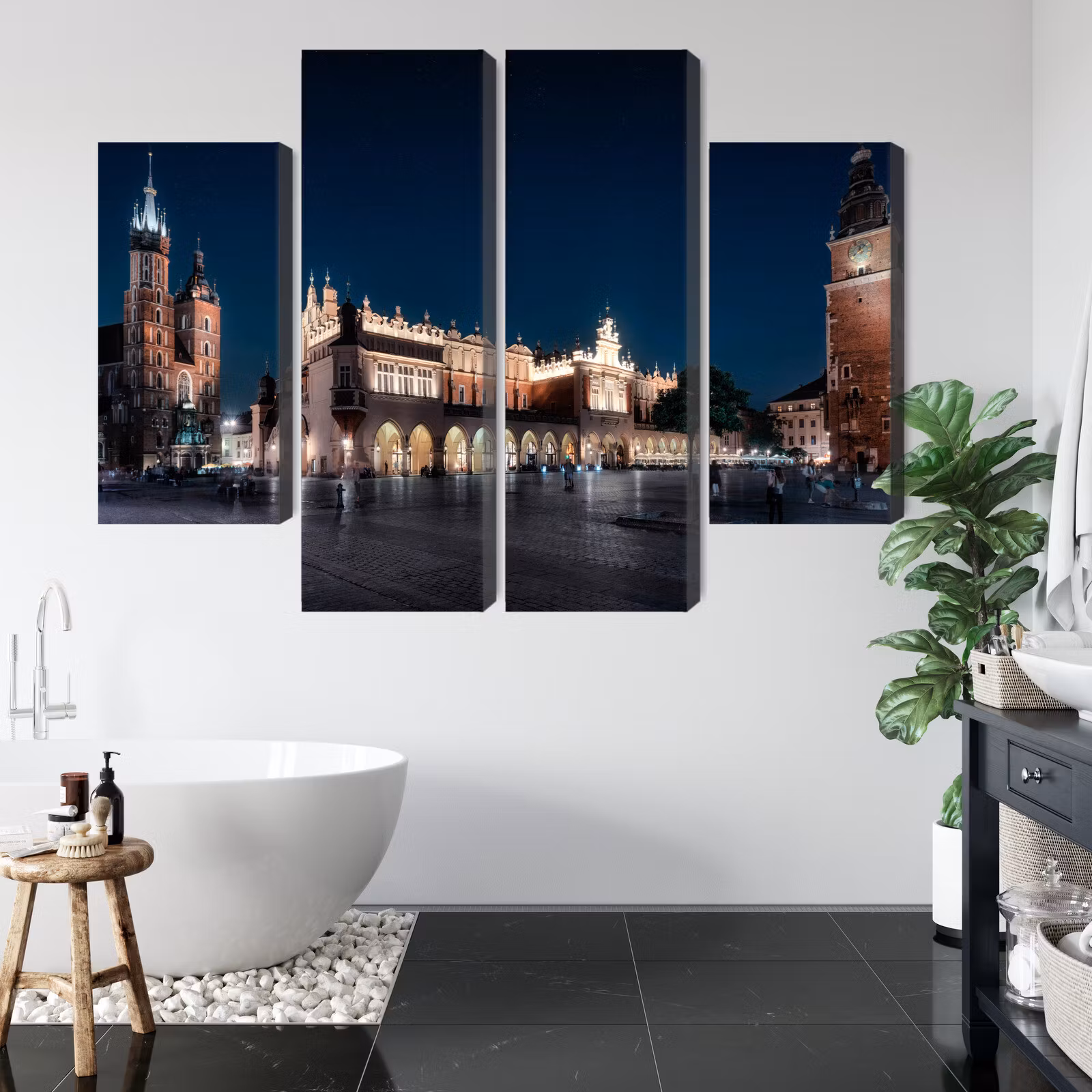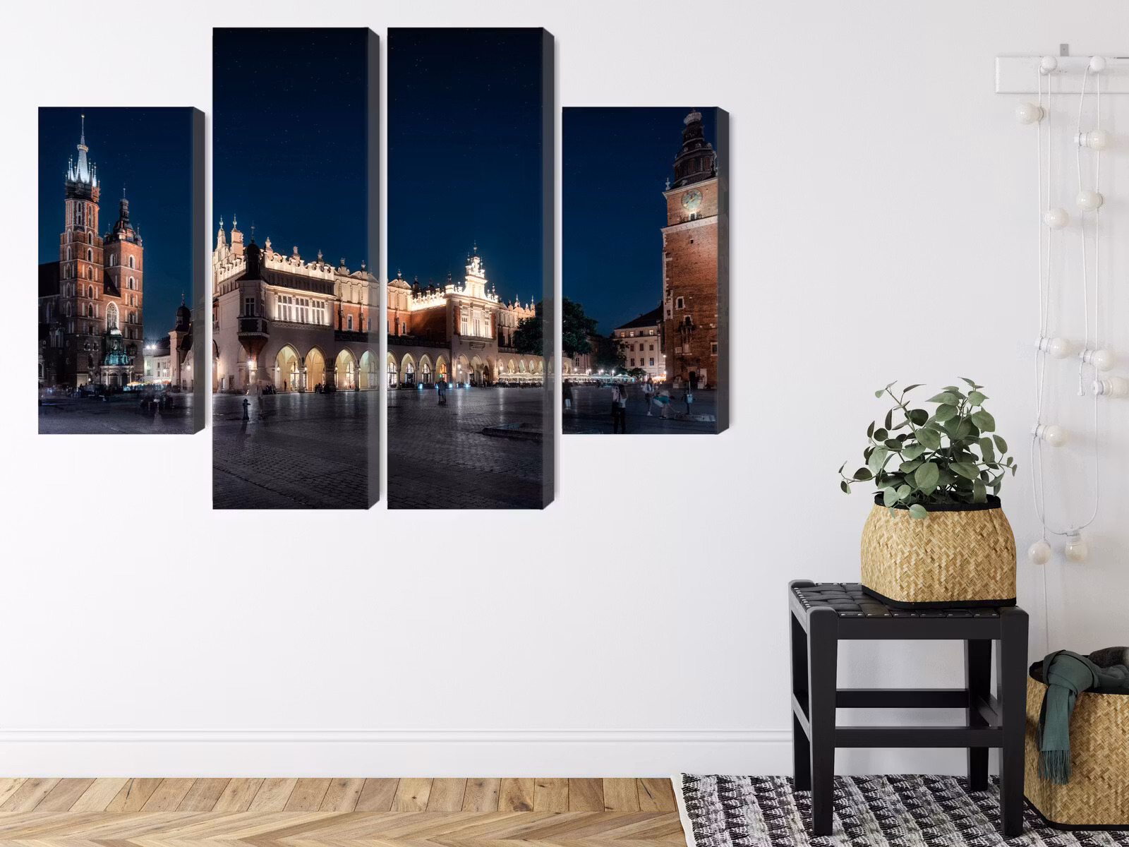 Motivet trycks runt hela ramen för ett stilrent och komplett utseende – ingen ytterram behövs. Tavlan levereras färdig att hängas upp; fäst bara ramen på en eller två skruvar. Kanttrycket gör att Krakow's cloth hall and st. framträder lika vackert från sidan som framifrån, och helhetsintrycket förblir lugnt och balanserat.