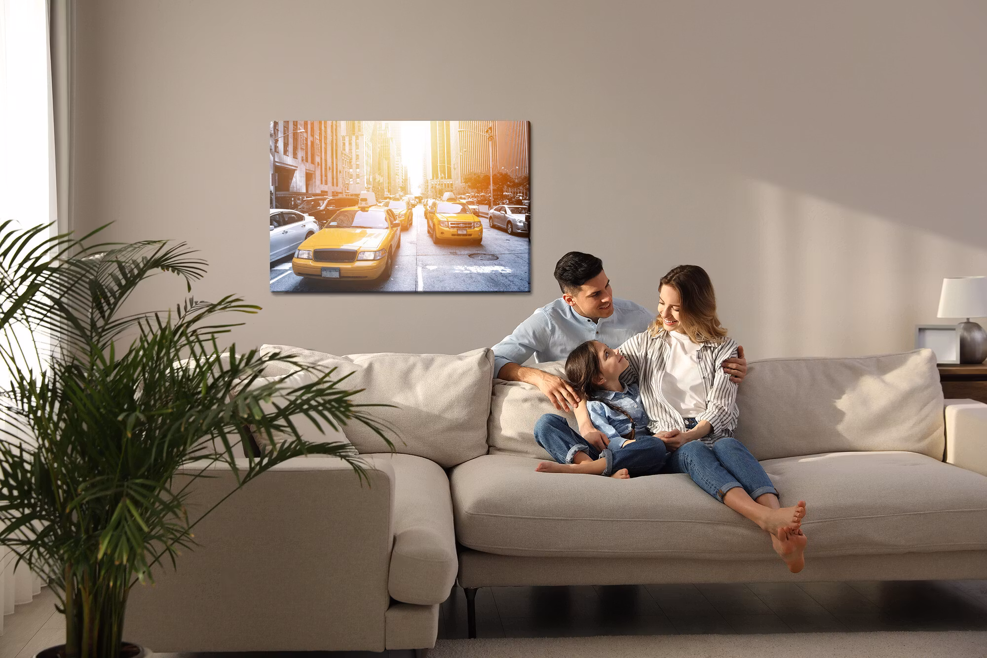 Motivet trycks runt hela ramen för ett stilrent och komplett utseende – ingen ytterram behövs. Tavlan levereras färdig att hängas upp; fäst bara ramen på en eller två skruvar. Kanttrycket gör att New york city taxis 3d framträder lika vackert från sidan som framifrån, och helhetsintrycket förblir lugnt och balanserat.