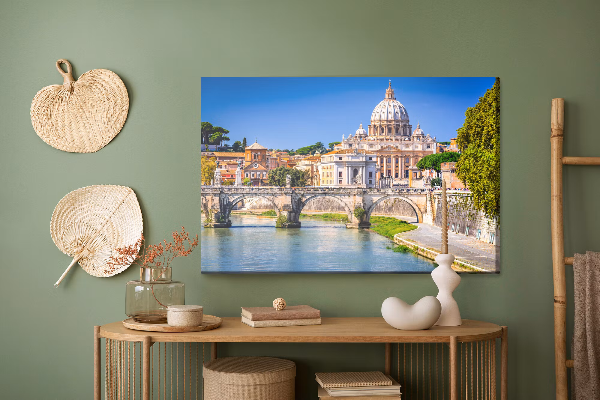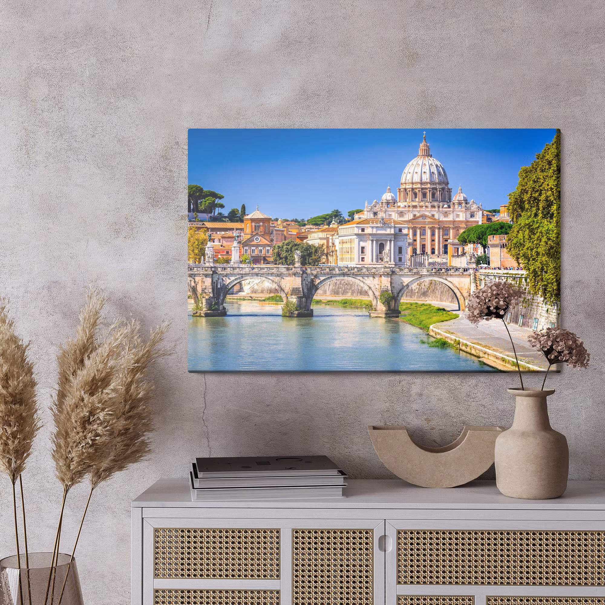 Motivet trycks runt hela ramen för ett stilrent och komplett utseende – ingen ytterram behövs. Tavlan levereras färdig att hängas upp; fäst bara ramen på en eller två skruvar. Kanttrycket gör att St. angel in rome framträder lika vackert från sidan som framifrån, och helhetsintrycket förblir lugnt och balanserat.